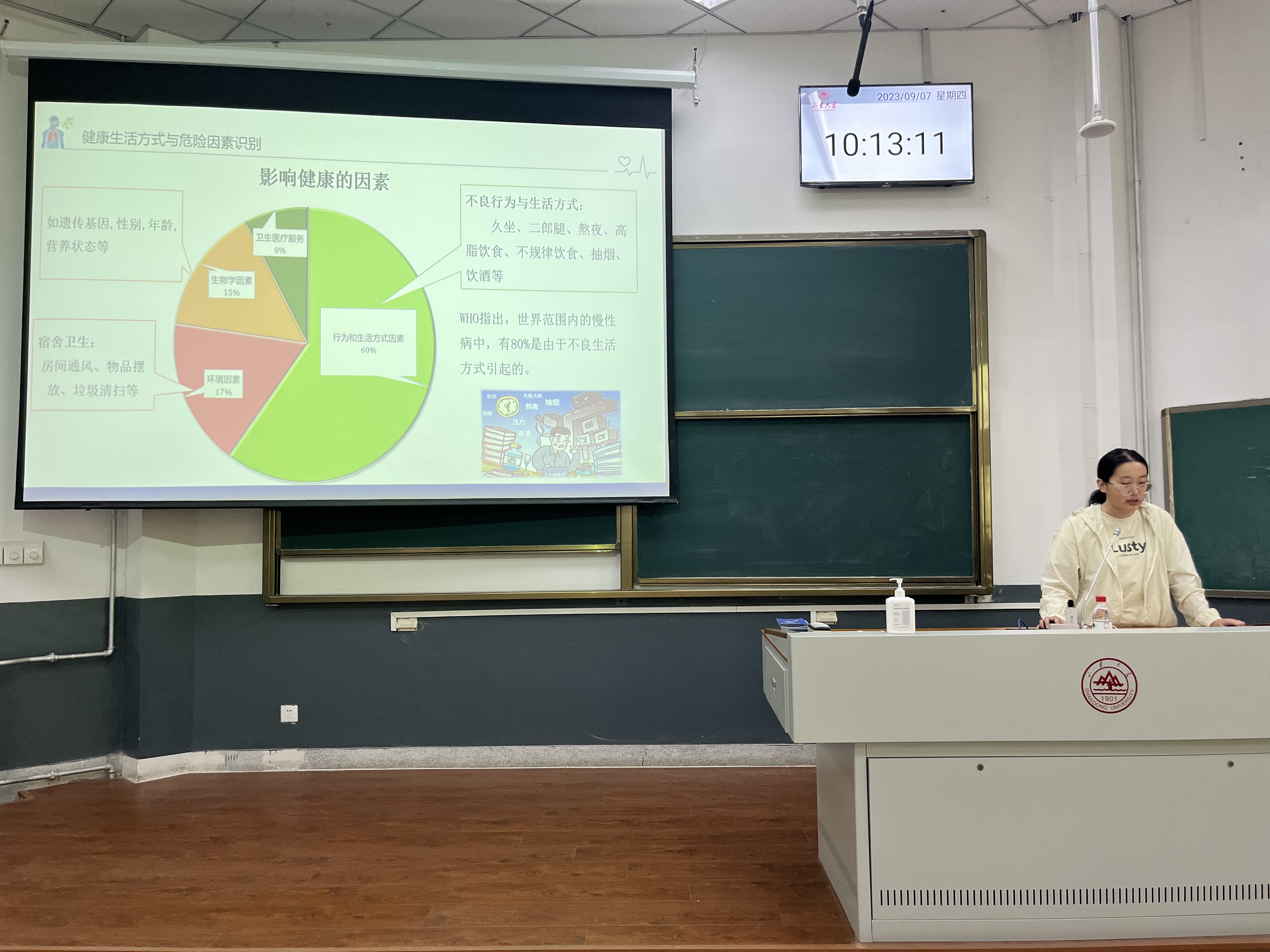 李双医生首先介绍到,健康不仅仅是指身体没有疾病,还应涵盖心理健康、良好的社会适应性和道德品质。她强调,正确认识校园常见疾病,采取准确的应对措施,实现“知、信、行”的统一,并树立“自己是健康的第一责任人”的观念,是新生入校后的首要任务。李双医生倡导同学们坚持健康的生活方式,保证充足的睡眠时间、适度的运动,保持饮食均衡,并努力落实“三减”和“三健”。她指出,膳食在整个生命周期中对人体生长发育和健康至关重要,长期保持规律和合理的饮食可以提高机体免疫能力,预防各种疾病。接着,她重点介绍了一些常见的校园传染病,如肺结核、水痘、麻疹、腮腺炎、流感和新冠病毒感染等疾病的特点、临床表现以及防控技巧。李双医生强调,只要综合了解病原学特征、流行病学特征和临床诊治方案,采取科学的防控措施,无论是新发传染病还是复发的古老传染病,都是可以预防和控制的。最后,李双医生向同学们介绍了校园就医指南和医保政策。校医院中心校区设有内科、外科、妇科、儿科、中医理疗科、口腔科、心理咨询门诊和接种门诊等科室,可以为师生提供常见病和多发病的诊断和治疗。心理咨询门诊则提供从医学角度出发的心理问题和困惑等方面的服务。此外,校医院还开设大学生健康教育课,帮助同学们获得系统的健康知识。讨论环节,在座师生就讲座内容提出问题,李双医生一一解答。