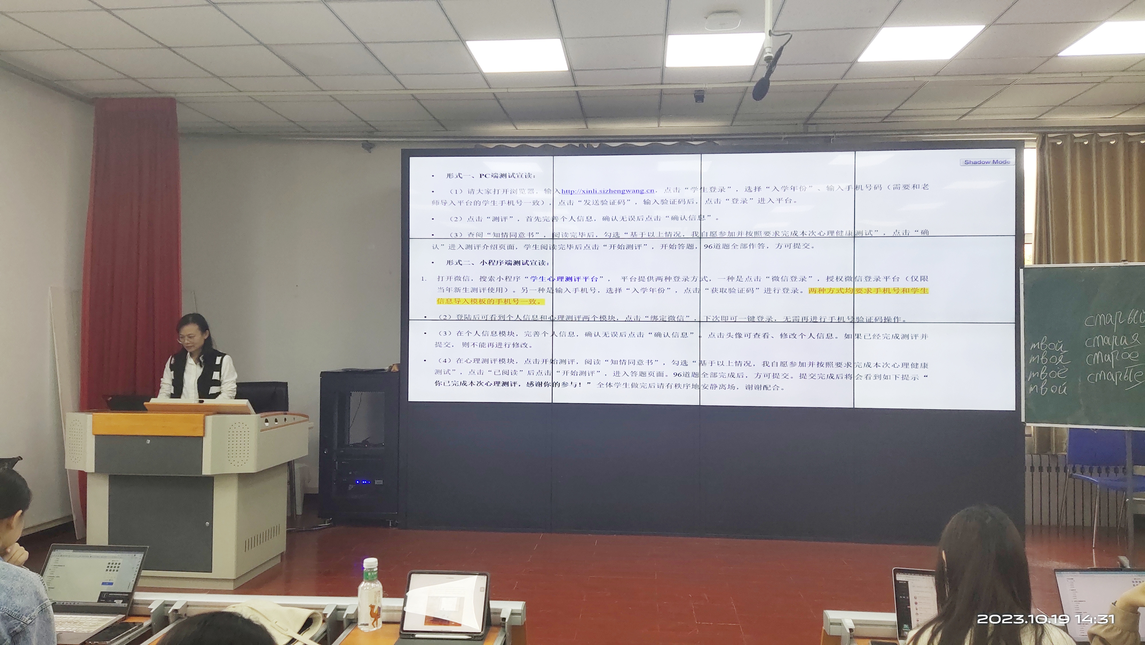 首先,辅导员介绍了心理健康测评活动的主要目的,即旨在让同学们对于自身目前的心理健康状况有进一步的了解,提高心理健康水平。辅导员向同学们说明了本次心理健康测评的结果将严格对外保密,而且测评的结果不会对同学们的升学就业产生影响。此外,同学们可以自主登陆系统查询测评结果,由学校心理中心的老师帮大家导出报告。如果想要进一步了解自身的心理状况,可以预约心理咨询。随后,辅导员细心向同学们展示心理健康测评的PC端和手机端两种方法,在场同学们积极配合,参加了心理健康测评。最后,辅导员提醒大家在日常生活中要时刻关注自己以及身边人的心理健康状况,遇到问题时及时向身边同学、老师寻求帮助,积极对待心理问题。
