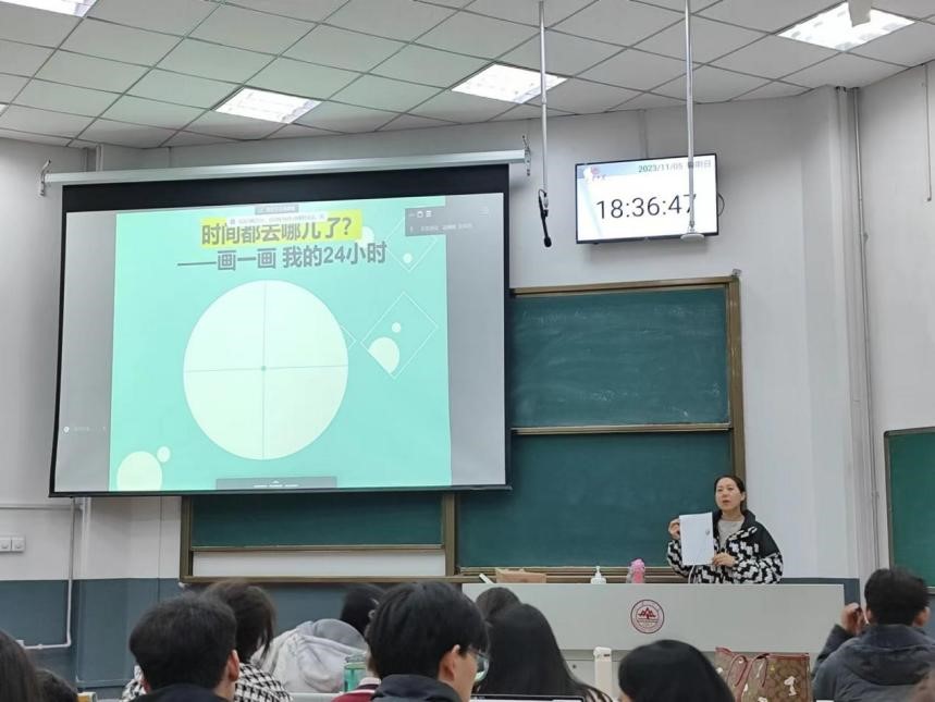 活动伊始,在提出了若干思考问题后,赵老师现场组织开展了“画一画我的24小时”互动环节,每位同学均在下发的饼状图中绘制了自己任意一天的时间规划安排,并进行了复盘与思考。
