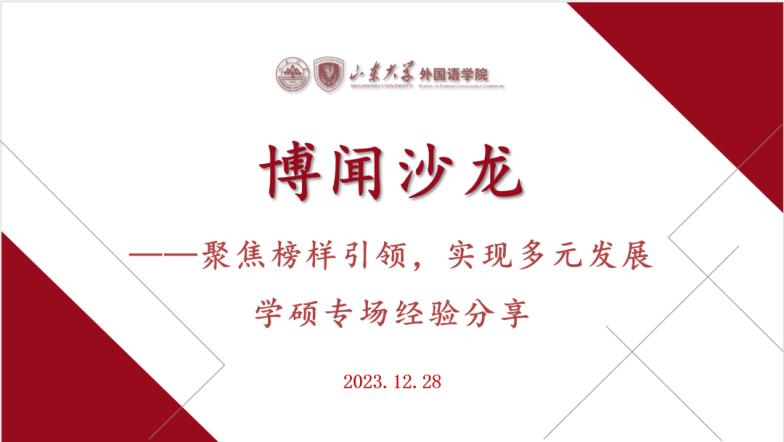 12月28日,第五期博闻沙龙聚焦榜样引领与多元发展。2022级外国语言学及应用语言学硕士研究生聂冰清从社会实践的内涵出发,分析了社会调查研究类、服务体验类和学术科研之间的异同和结合点,呼吁同学们在服务社会中实现自我价值。2022级英语语言文学硕士研究生任正邦针对学术科研问题,推荐了文献检索平台,并结合自身学习经验分享了专业学习心得。2022级英语语言文学硕士研究生任秀玲结合自身实习经历,详细阐述了外语专业契合的企业、部门和岗位,以及获取信息的渠道,并分享了面试加分点,鼓励同学们勇于通过实习提升自己。