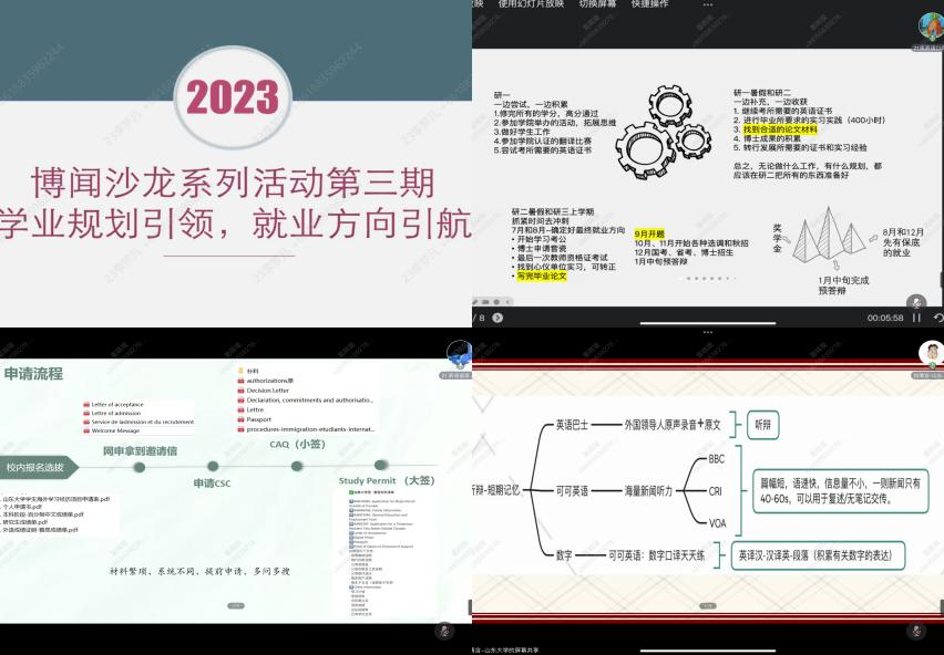 12月13日,第三期博闻沙龙聚焦学业规划和就业方向。2021级英语口译硕士研究生吴浩然结合自身经历介绍了三年具体规划,为口译专业学生提供建议。2021级英语语言文学硕士研究生何红分享了海外高校申请流程及加拿大学习生活情况,强调了环境对语言学习的重要性。2021级英语口译硕士研究生刘倩含分享了口译学习经验,强调口译学习需要坚持不懈与大胆实践。2022级英语口译硕士研究生杨佳宁介绍了学校对国际组织实习的支持和自身在联合国工业发展组织的实习经历,鼓励同学们提升行业认知和了解多元文化。