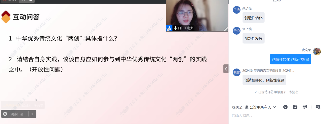 在互动问答环节,团队针对宣讲内容设置相关思考题以深化概念理解,与会人员积极互动,现场气氛热烈。王衍力同学就中华优秀传统文化的“两创”的定义和如何在自身实践中进行中华优秀文化“两创”两点进行了提问。现场同学积极回答,纷纷就自身实践经历发表自己的见解,对本次宣讲内容有了更深入的理解。