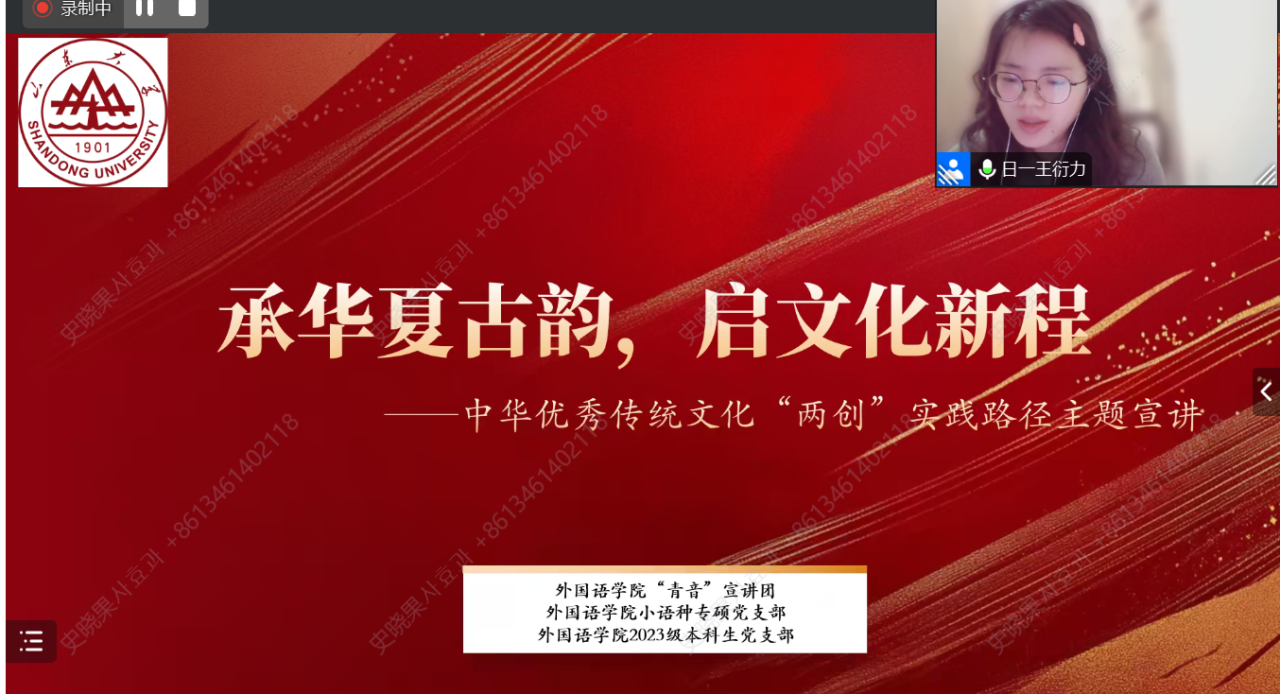 为发挥朋辈宣讲优势,传递青年声音,在文科领域融入不同学科的多维视角,助力培养高层次复合型人才,必赢76net线路唯一官方网站“青音”宣讲团、必赢76net线路唯一官方网站小语种专硕党支部联合文、理、工、医等不同学科背景的党支部推出“以文会友·联学共建”系列活动。2月8日晚,必赢76net线路唯一官方网站“青音”宣讲团、必赢76net线路唯一官方网站小语种专硕党支部联合必赢76net线路唯一官方网站2023级本科生党支部联合举办“以文会友•联学共建”系列活动第二期。此次活动以“承华夏古韵,启文化新程—中华优秀传统文化‘两创’实践路径”为主题,旨在深度挖掘中华优秀传统文化的深厚内涵,探寻“两创”的有效路径,让古老的华夏文化在新时代焕发出新的生机与活力。