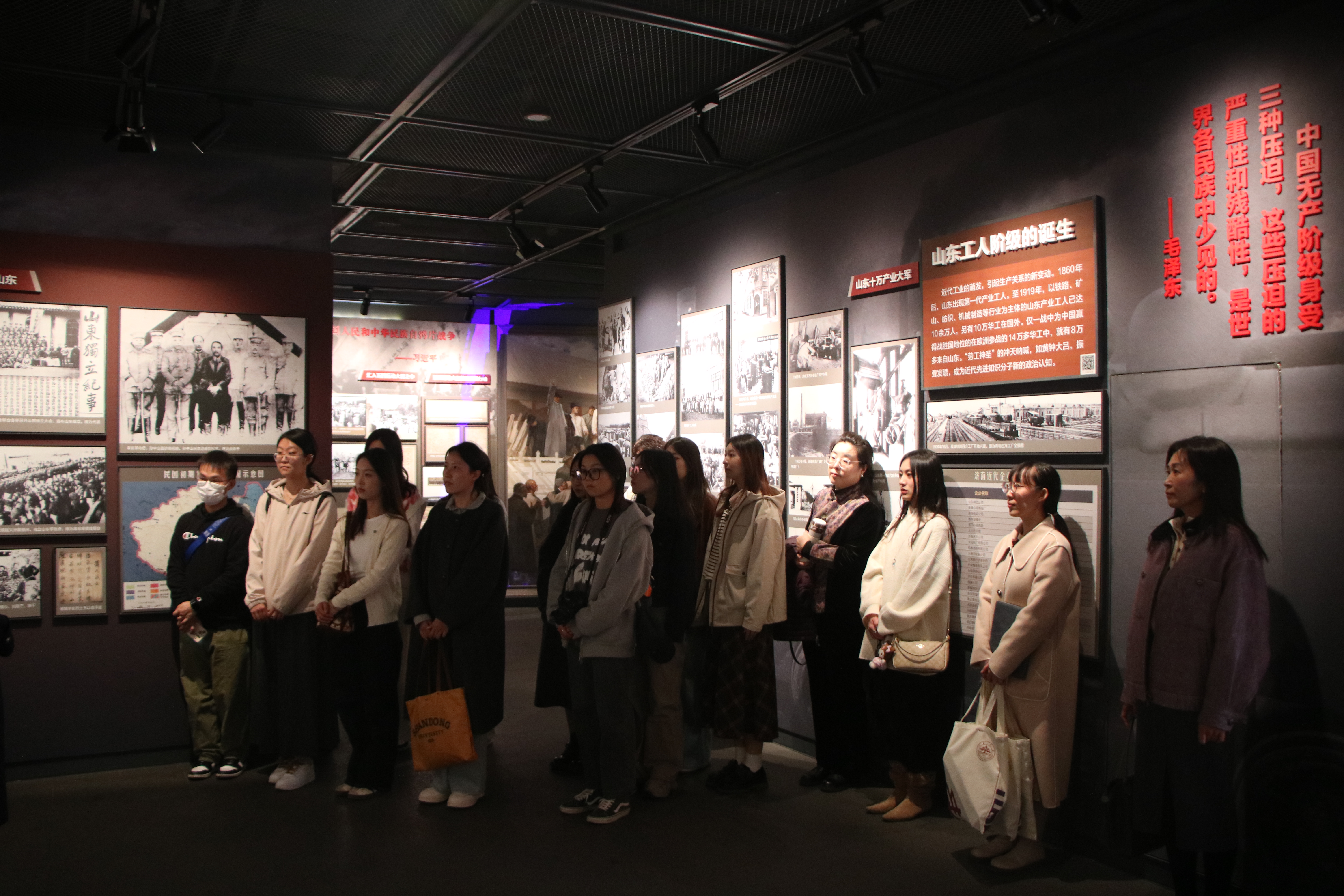 在讲解员的引领下,师生步入中共山东早期历史纪念馆,沉浸式体验了一场红色实景思政课程。通过“社会变革 历史选择”“点燃星火 彰显初心”等六大主题展厅,师生学习了山东早期党组织创建发展的光辉历程,深切缅怀王尽美、邓恩铭等革命先驱的丰功伟绩。这场行走的思政课不仅让红色基因融入血脉,更激励着新时代青年以革命精神为灯塔,在民族复兴征程中续写青春华章。