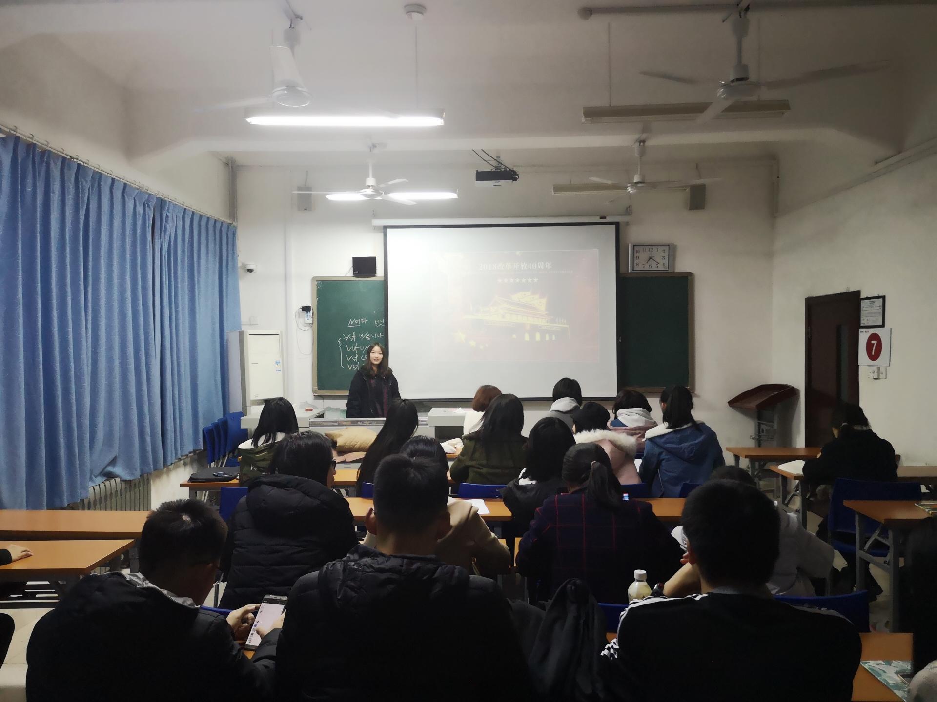 在本次活动中团支部书记李静制作了ppt,为团支部成员讲解了改革开放40年的历程以及40年来经济、政治、社会等方面的重大转变。在场的同学们积极发言,表达了对改革开放的感想以及对祖国未来的美好祝愿。
