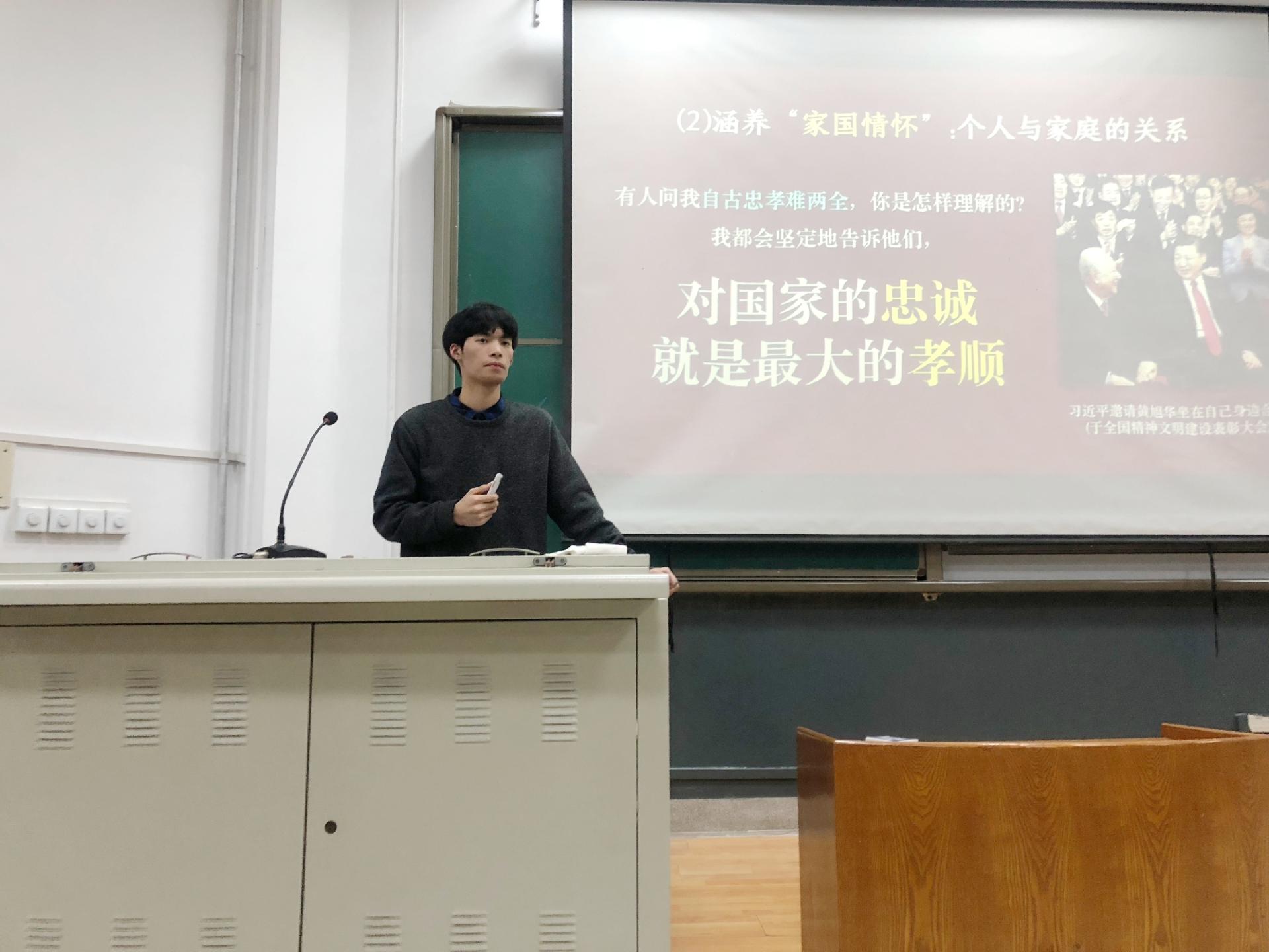 宋梓洺分享了他对于中国外交新变化的理解,从外交定位、文化自信、外交布局三个角度进行了阐述,并结合中美、中俄、中欧等双边关系作了案例说明。他在宣讲时指出,当今世界是你中有我我中有你的世界,国家之间要合作共赢,有海纳百川的气魄;他还强调了青年人必须有强烈的国家情怀、坚定的政治立场,更要有责任和担当意识。