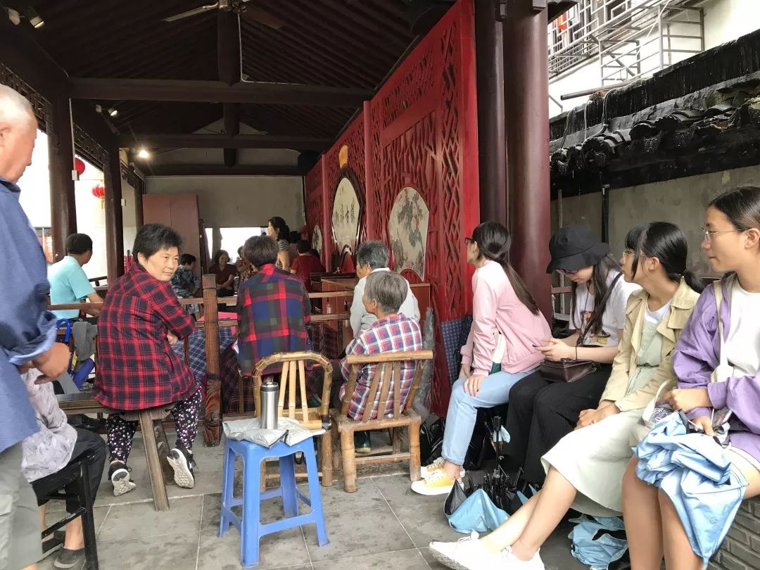 调研第一天,古镇下起了淅淅沥沥的小雨,景区内人流不多,给小组成员的采访调研带来了一定的挑战。小组成员先是采访了一家当地餐馆状元楼的店主,了解了南浔古镇在开发的过程中给当地的居民生活所带来的影响以及在开发过程中如何应对外来文化的措施。下午,小组成员们深入到古镇内部,通过参观古镇的历史遗迹、名人故居来了解古镇的文化。在古镇内,通过聆听欣赏当地的方言弹唱表演——杜十娘,感受到吴语的魅力;景区内四处可见的当地戏剧表演节目场地前不仅坐满了当地的居民,更是吸引了一大批游客驻足欣赏。组员们利用一场场戏之间的短暂休息时间,和观赏戏剧的当地老年人进行了关于戏剧表演的交流,了解到了不少关于戏剧的知识,更发掘到深埋在南浔人心底的那一份对传统戏剧的热爱。