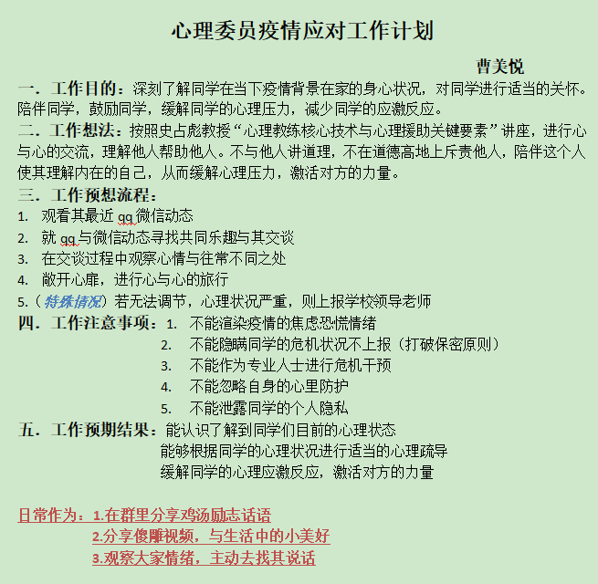 由中国心理学会与中科院心理所联合开展的“抗击疫情 安心行动”系列讲座,18位专家组成员接力进行20场专题宣讲,于2月12日-14日面向全国高校心理委员开展。受此号召,必赢76net线路唯一官方网站积极组织本科生及研究生开展适应疫情的网上学习交流活动,活动形式为网上观看直播、线下记录心得、线上讨论分享的新形式。既能促进疫情带来的长假期中学生之间的交流,又可以提高心理委员工作能力,辅助调节学生心理状态,以协助学院更好地应对疫情期间学生产生的心理问题。