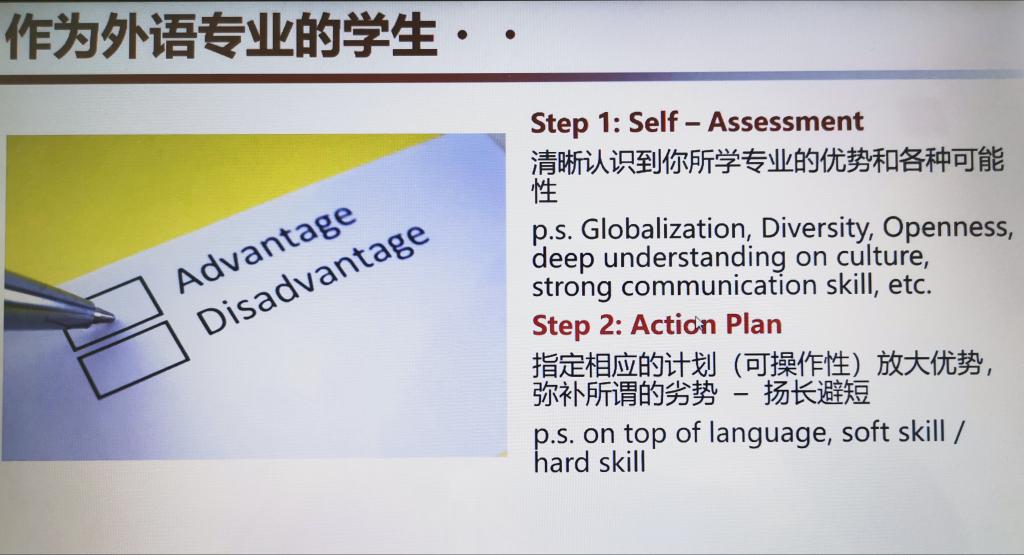 首先,针对外语专业学生的优势以及如何放大优势这两个问题,龚晓萌提出要明确自身优势,针对主要矛盾,利用充足的准备抓准时机,不断尝试。她通过介绍自己在日本住友集团与宝洁公司的工作经历,分享其总结的心得体会。受自己的经验启发,她向同学们分析日企和美企的不同特点,并鼓励同学走出舒适圈,勇于试错,以发现自己的潜在能力。