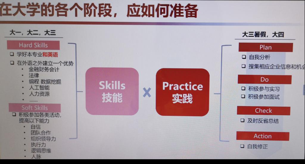 随后,龚晓萌详细分析了如何在大学四年的各个阶段进行自我规划与准备。首先,她建议同学们提高自身的专业技能与软实力,并通过实践演练专业技能,以提升并完善相关能力。接着,为了丰富同学们的视野,拓展他们的技能,她结合自身在招聘工作的丰富经验,分享简历制作及良好面试表现的方法,提醒同学们在面试的过程中,确认清楚,冷静思考,条理清晰,逻辑严谨。