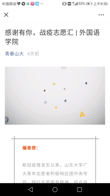 “公译战疫”平台借助以高校为主的外语人才资源,在疫情期间同心协力、尽己所能,为国家抗击疫情贡献力量。该平台充分展现了青年人的爱国精神与责任担当,为防疫一线贡献青年力量,向社会展现了山大学子的青春风采。