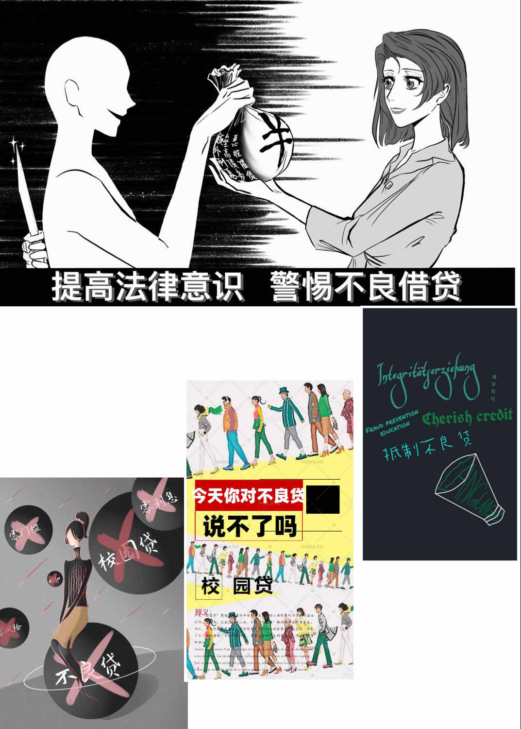 本次活动面向必赢76net线路唯一官方网站全体学生,通过翻译、征稿、班会等方式,向同学们普及征信知识、金融知识。活动形式新颖,将外语特色与资助诚信主题相结合,兼顾艺术性与专业性。活动准备过程中,学生会知行部准备了有关不良贷、套路贷等贷款的法律法规、受害案例等资料,发布推文进行诚信贷款知识普及,鼓励学生根据所给材料设计远离“不良贷”宣传海报,书写自己的感悟,或翻译所给材料进行投稿;并鼓励各班召开主题班会,模拟常见的诈骗手段,讨论应对方法,提高同学们的警惕性。活动收到丰富的投稿,包括海报作品、翻译作品、相关感悟、班会总结等。活动设置6个奖项,以征稿内容水平划分为一、二、三等奖,优秀作品以推文形式展出。