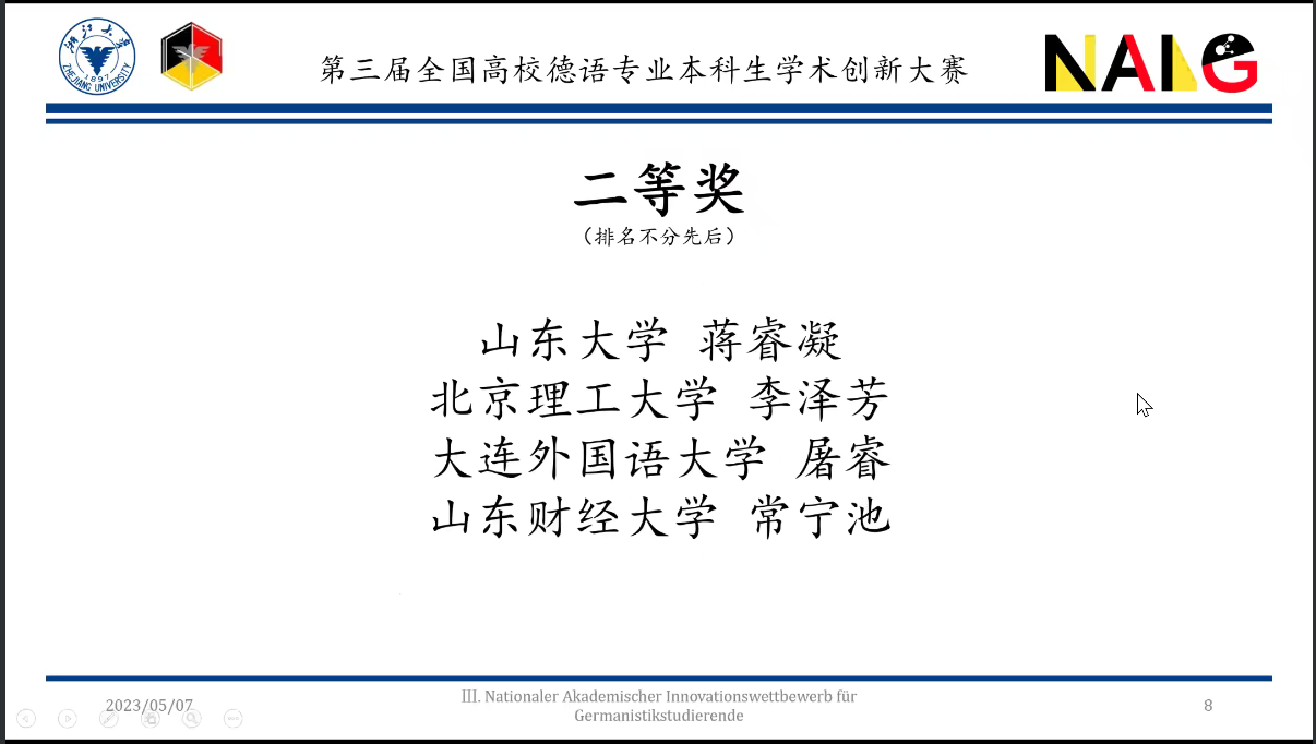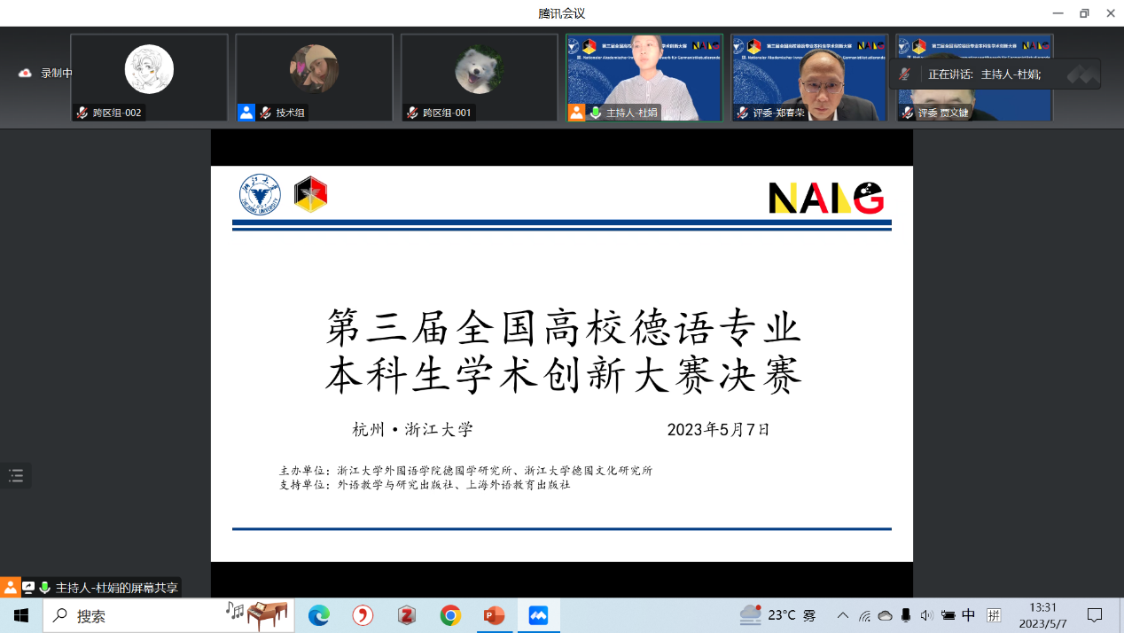 “全国高校德语专业本科生学术创新大赛”是由浙江大学必赢76net线路唯一官方网站德国学研究所、浙江大学德国文化研究所于2021年发起的一项全国竞赛,旨在为中国高校德语专业本科生打造跨校、多领域科研创新实践交流平台。本次比赛分为文学、语言学和跨文化与区域国别三大赛道,吸引数十所高校的百余支团队参赛,其中跨文化与区域国别赛道参赛队伍共计53支,赛道专家评委由北京外国语大学副校长贾文键教授和同济大学必赢76net线路唯一官方网站党委书记郑春荣教授担任。在比赛中,蒋睿凝同学高质量完成学术论文作品,通过了淘汰率高达80%的初赛选拔,进入决赛,后经过学术展示和评委提问环节,最终获得该赛道第二名的好成绩。