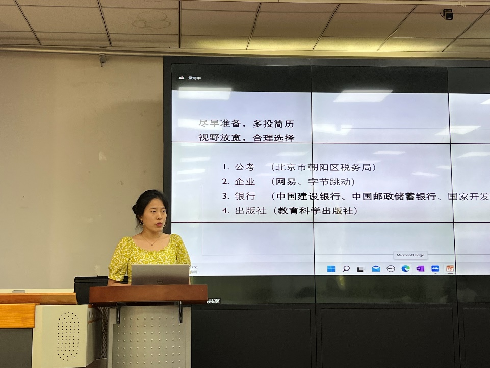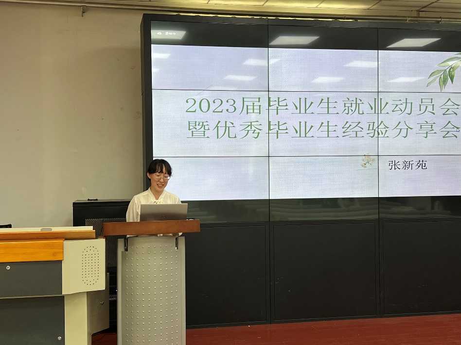 随后,研究生辅导员张新苑老师结合自己的求职经历进行了就业经验分享。首先,张新苑提醒同学们以一颗平常心和清醒的认知对待就业问题,抓住秋招的机会,坚持尝试,并关注后续微信群内的就业信息和就业专场分享会。接着,张新苑从时间观念、求职分享以及辅导员求职观察三个方面与同学们进行分享。她提醒同学们,遵守时间观念,及时查看通知。在选择就业方向时认清自己的优势,找准自己的赛道,并早做准备,把握应届毕业生的优势,切忌眼高手低。最后,她结合实际分别对研二和研一的同学们给出了几点切实可行的就业建议,鼓励大家树立信心。