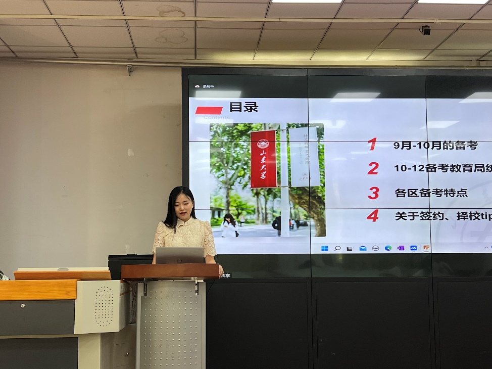 接下来,在优秀毕业生经验分享会上,来自2019级英语笔译专业的刘琮、朱文博,2019级英语口译专业的王子纯作为优秀毕业生代表与同学们分享了自己的求职过程与经验。刘琮建议大家尽早准备,多投简历,视野放宽,合理选择,并介绍了自己准备公考、企业、银行和出版社求职时的经历与经验。王子纯聚焦深圳教师招聘,从各阶段的备考情况、深圳各区备考的不同特点以及签约择校等方面分享了自己的教师应聘经验。朱文博从求职经历、就业感悟、资源分享等方面进行了经验分享,介绍了公考、选调、高校、事业单位、企业的具体情况,分享了准备过程中用到的资源,并给出了做好选择、提前规划、克服障碍、互帮互助、摆正态度、总结经验等建议。
