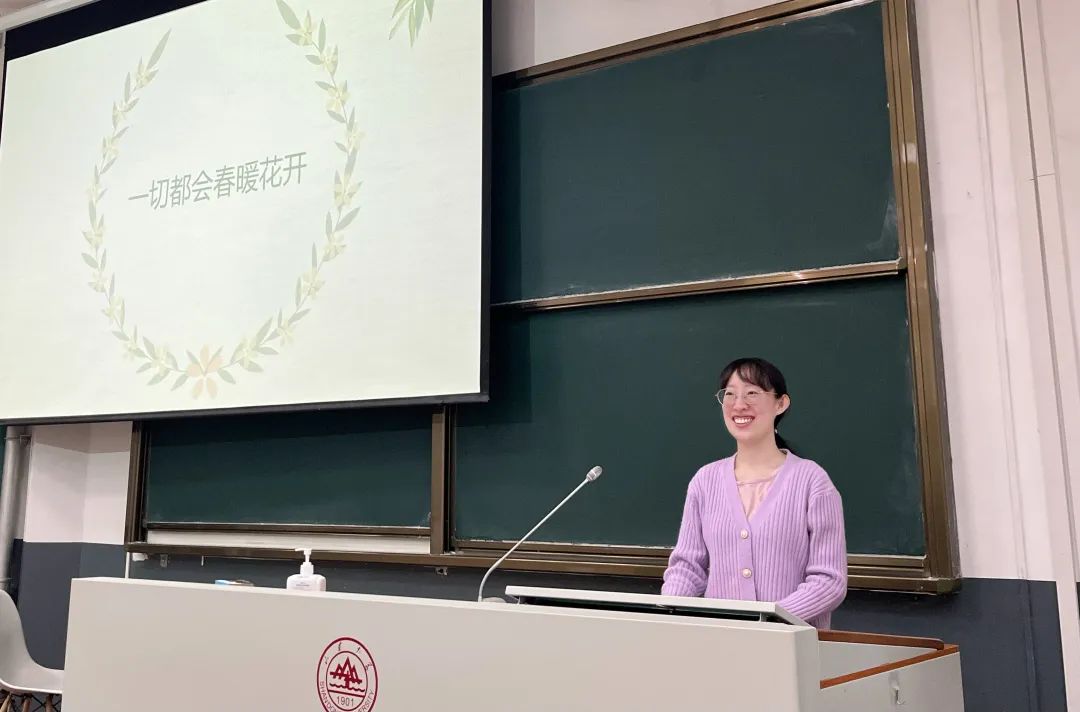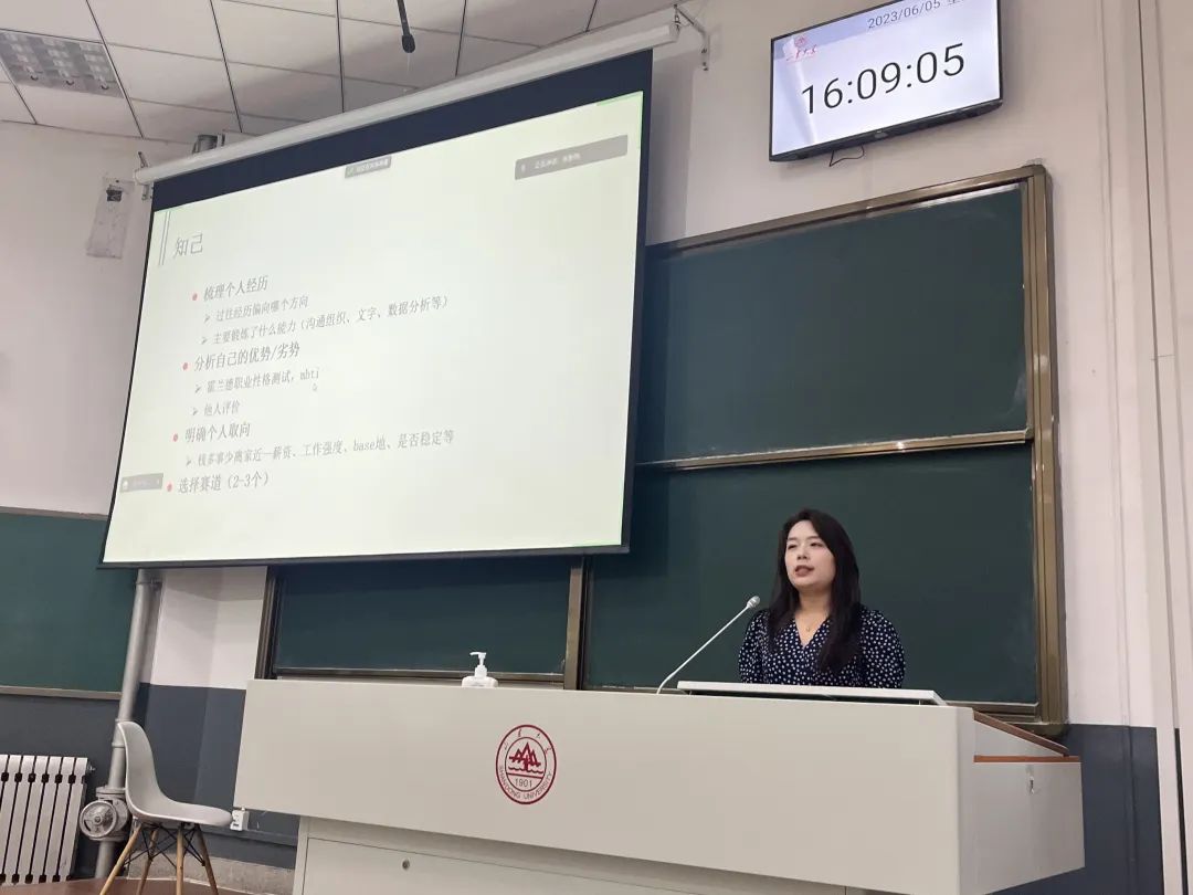 随后,张新苑从时间观念、自身求职经历以及辅导员求职观察三个方面与同学们进行分享。首先,张新苑提醒同学们加强时间观念,提高自主性,关注相关网站通知和时间节点,抓住秋招机会,并关注后续微信群内的就业信息和就业专场分享会。接着,她结合个人经历提醒同学们合理安排写论文和找工作的时间,充分准备笔试和面试,前期全面了解各个行业,不要局限思维。最后,她结合实际分别对研二和研一的同学们给出了就业建议,在选择就业方向时认清自己的优势,找准自己的赛道,踏踏实实早做准备,把握应届生优势,切忌眼高手低。