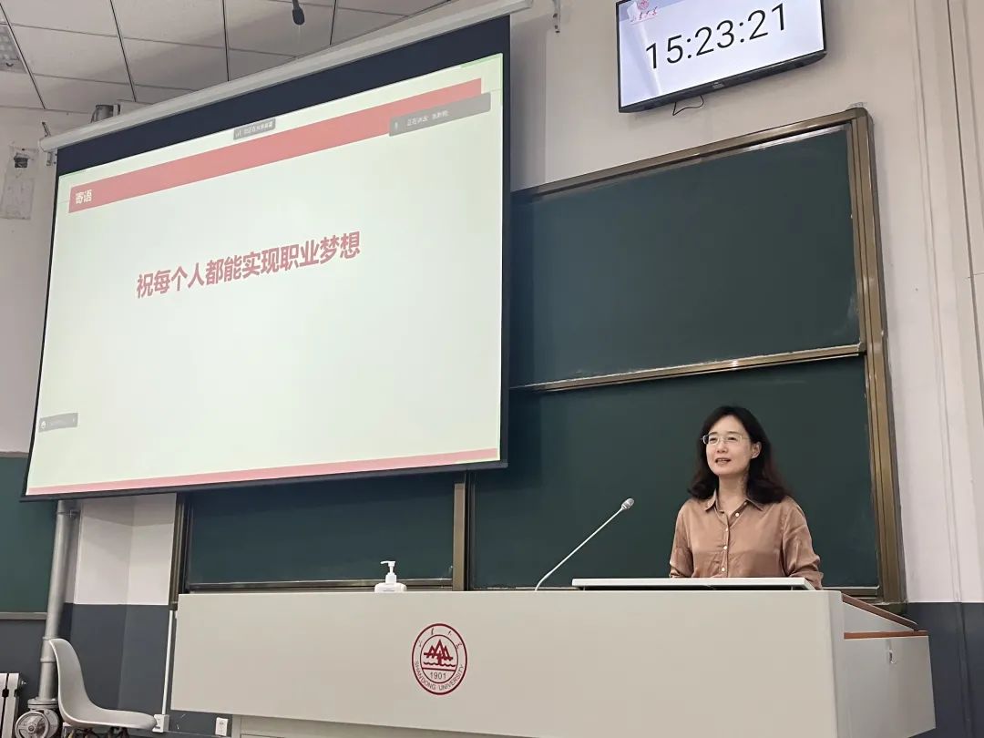 接下来,在优秀毕业生经验分享会上,2023届优秀毕业生代表戚瑞茜、司泽人、陆曦可分别与同学们分享了企业、考公、教师的求职过程与经验。戚瑞茜向大家介绍了自己的求职过程、学硕论文撰写和求职的时间阶段、编辑岗位的特点,还分享了详细的实用软件和技巧。司泽人聚焦公考选调,从选择考公的心路历程、报考流程、具体的备考建议、规划时间与合理选择等方面分享了自己的选调经验。陆曦可分享了教师的职业特点,对包括简历、面试、时间规划等前期准备的具体建议及就业感悟。