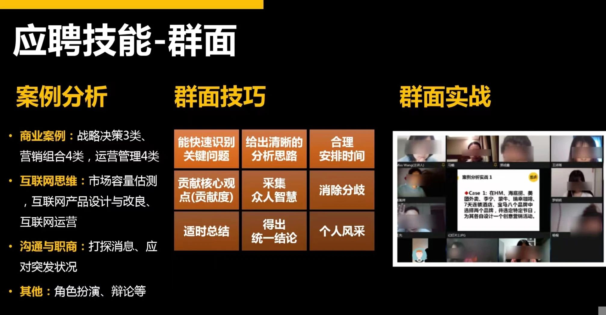 针对以上两位师姐的求职经验分享,孔翔着重为同学们分析了群面能力提升技巧。他表示,能够快速识别关键问题并给出清晰分析思路能够助力同学在群面中脱颖而出。当然,更重要的是,同学们要结合各种案例勤加练习。