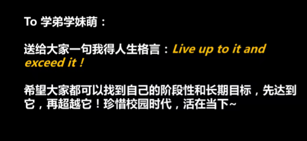 第二位嘉宾师姐曾获得宝洁、联合利华、字节跳动等实习&校招Offer。师姐结合自己的切身经历,带大家复盘了字节跳动和联合利华的求职历程。师姐同样强调了面试表现的重要性。除了学习面试技巧,她鼓励同学们提升自己的英语表达能力,为自己争取更大优势。她还表示,要勇于设立目标,这样能够督促自己不断前进。