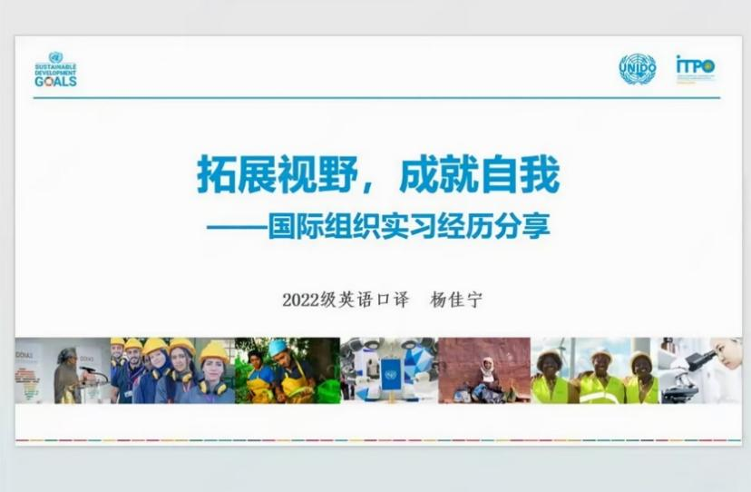 在分享会的开场,2022级英语口译专业硕士研究生杨佳宁首先介绍了学校对于国际组织实习所给予的政策支持,并基于国际组织实习的诸多益处,积极鼓励同学们勇于尝试。杨佳宁以其本人在联合国工业发展组织投资和技术促进办公室(中国·北京)的实习经历为例,阐述了在国际组织实习不仅能够积累宝贵的外事活动经验,还能有效提升翻译技能,拓宽对不同行业的认知视野,为日后步入职场奠定坚实基础。随后,杨佳宁同学详细阐述了实习申请的多种途径,并贴心建议同学们应根据自身所处的学习阶段,精心挑选适合的岗位进行申请,同时鼓励大家积极投递简历,增加成功的机会。此外,她还提醒同学们在日常学习中要注重专业知识的积累,并着力培养跨文化沟通协作能力和持续学习的能力,以全面提升个人竞争力。
