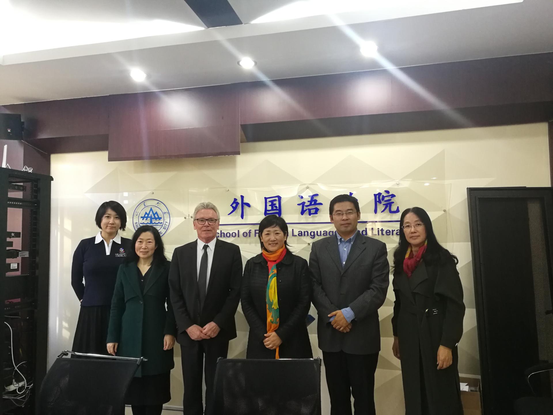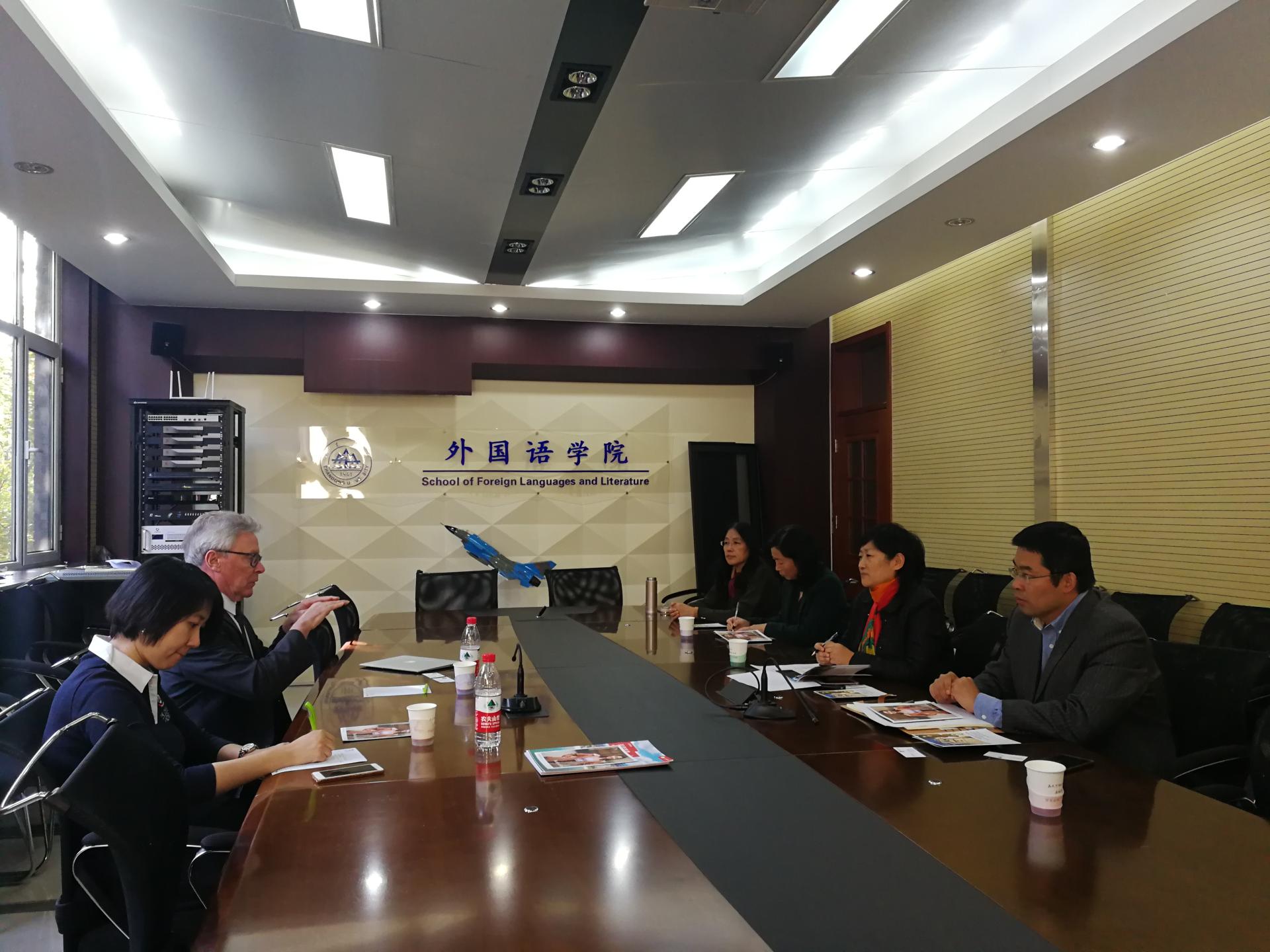 1026日,澳大利亚阿德莱德大学文学部国际事务副部长Mark Carroll教授等一行二人访问必赢76net线路唯一官方网站,必赢76net线路唯一官方网站王俊菊院长、刘洪东副院长、MTI中心主任侯萍萍副教授及应用英语系主任卢敏教授等人参加了会谈。