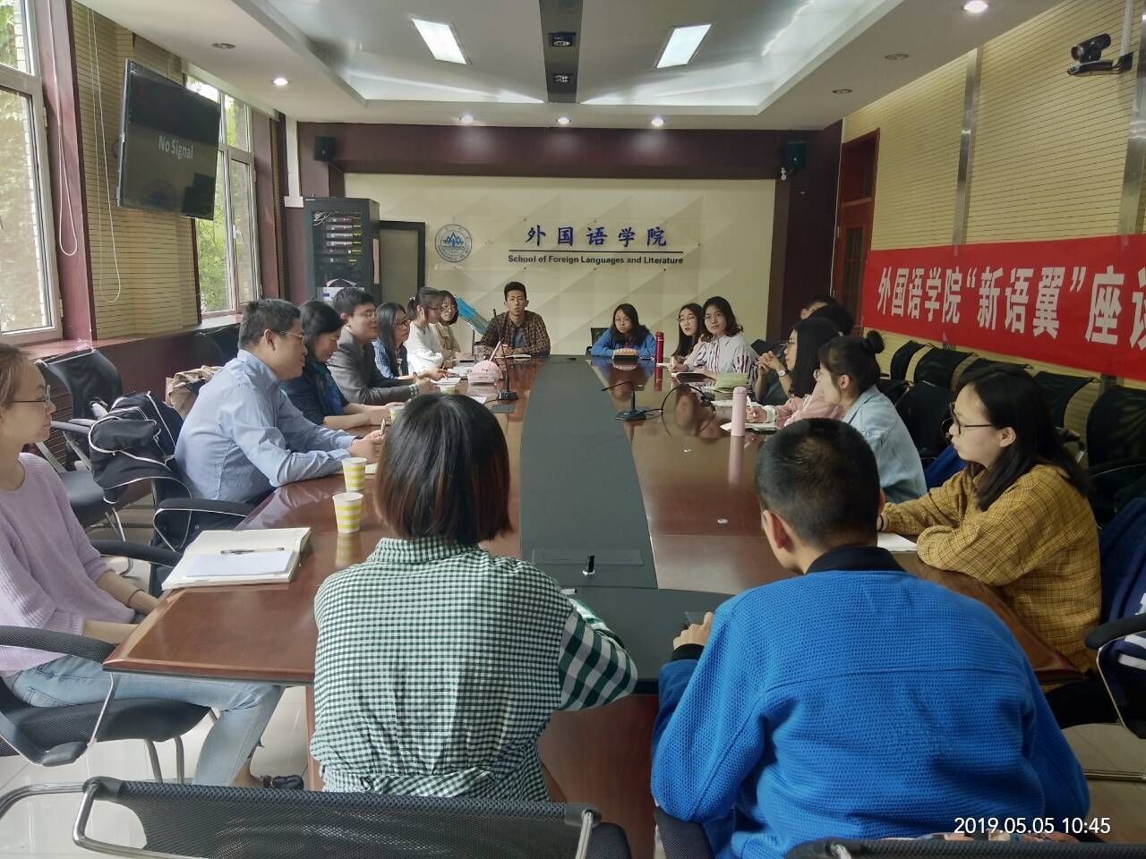 5月5日上午,必赢76net线路唯一官方网站杰出青年校友、北京第二必赢76net线路唯一官方网站高级翻译学院副院长姜钰做客“新语翼”座谈会,必赢76net线路唯一官方网站党委副书记魏鲁鸿、团委书记朱蕾、翻译硕士(MTI)教育中心主任侯萍萍及英语系、翻译系各年级学生代表与姜钰进行了深入交流。