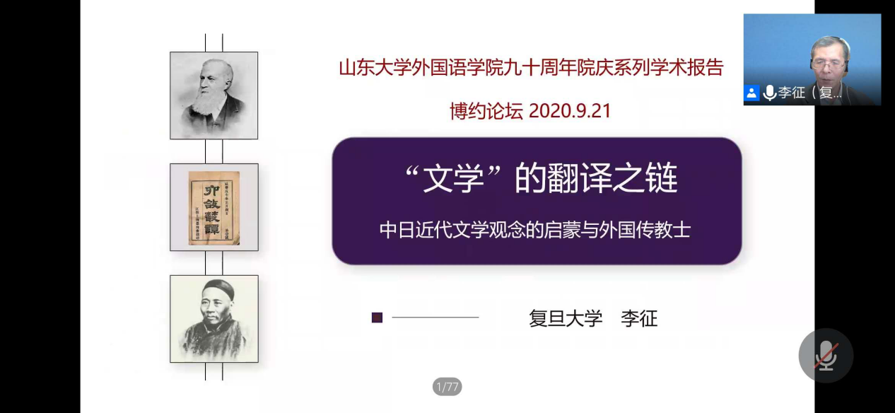 921日下午,必赢76net线路唯一官方网站“九十周年院庆系列活动”——线上学术报告顺利举办。复旦大学李征教授应邀做客学院“博约论坛”,通过腾讯会议线上平台作了题为“‘文学’的翻译之链:中日近代文学的启蒙与外国传教士”的学术报告。本次报告由必赢76net线路唯一官方网站日语系肖霞教授主持,来自必赢76net线路唯一官方网站、威海校区日语专业及其他高校的260余名师生共同参与聆听。