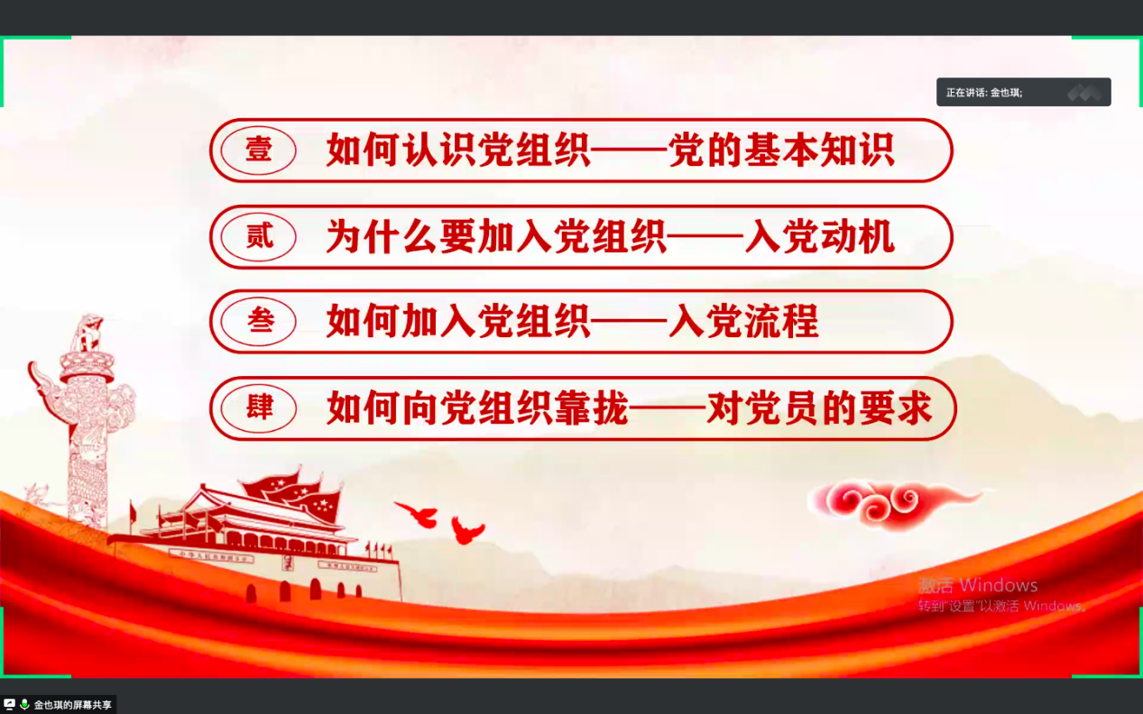 随后,金也琪正式开展党课教育。她从党的基本知识、入党动机、入党流程及对党员的要求四个方面进行讲解。金也琪通过党的性质、党的最高理想、党的根本宗旨及党的指导思想四个方面介绍了党的基本知识。她同时强调,党的先进性,为我国抗击新冠肺炎疫情斗争提供了极大的制度优势。接着,她以“为什么要加入党组织”这个问题,引出了学生对入党动机的思考。金也琪表明,端正入党动机,不是入党前一时的问题,而是一辈子的问题。在介绍完入党条件后,金也琪详细介绍了党员发展流程和入党申请书的内容和格式。在她看来,发展党员是一个漫长的过程,党组织对党员的筛选极其严格,新生应在明晰入党动机的基础上,尽早开始入党流程。紧接着,金也琪向新生展示了必赢76net线路唯一官方网站本科生党支部的工作与活动日常。她特别介绍了外院本科生党支部在疫情期间创立的“公译”翻译平台和已延续两届的“新火”宣讲团两个组织。最后,金也琪对有意愿加入党组织的新生提出几点要求。一,不断端正自己的入党动机——从党史入手;二,按照党员标准严格要求自己,在思想上自觉加强党性锻炼,在学习中不断提升自己的理论水平、文化素质和工作能力,及在生活中牢记党的组织,做全心全意为人民服务的模范。党课最后,张明明对党课内容进行总结,并鼓励新生积极进取,以高标准要求自身,争取加入党组织,更好地贡献自己的力量。