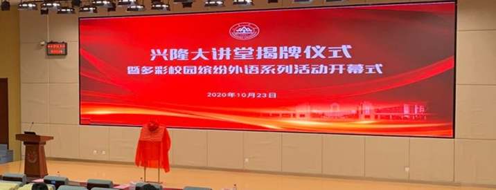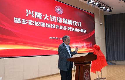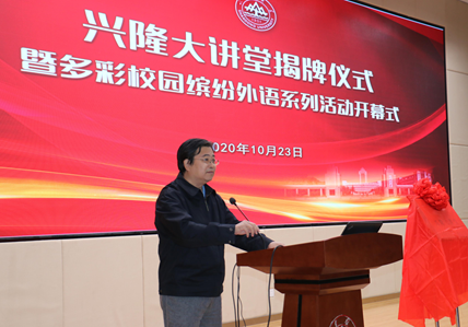2020年10月23日晚,兴隆大讲堂揭牌仪式暨“多彩校园、缤纷外语”系列活动开幕式在兴隆山校区讲学堂101报告厅举行。校党委副书记仝兴华为兴隆大讲堂揭牌并讲话。