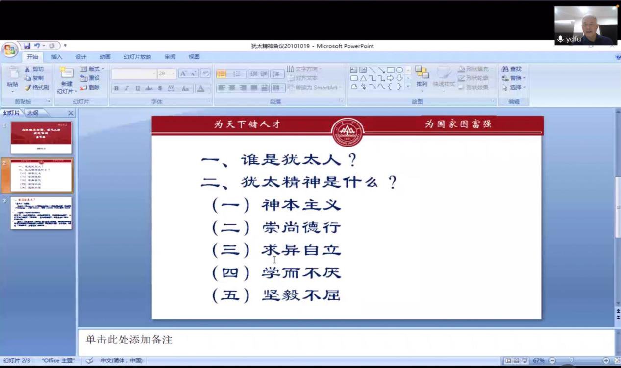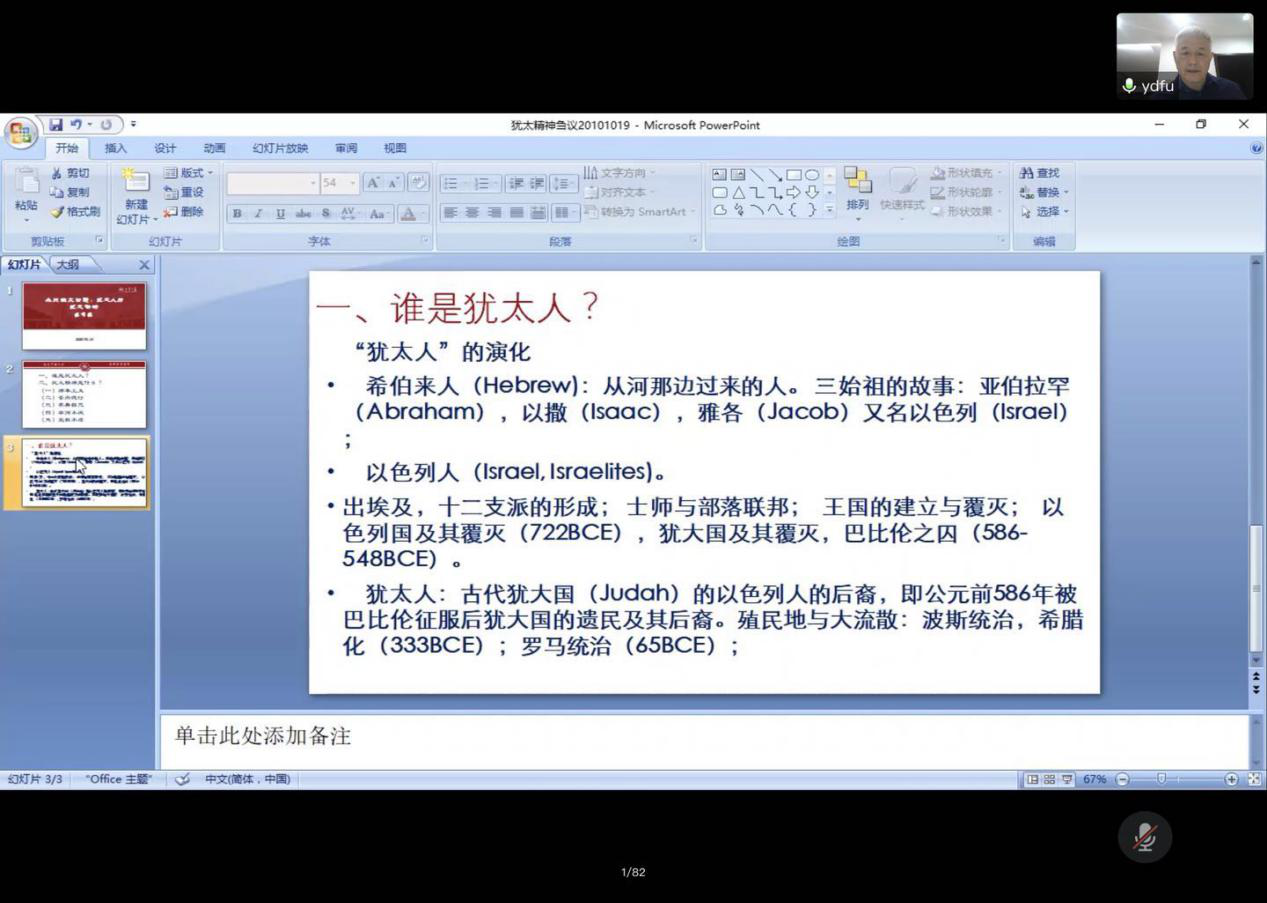 10月23日晚,必赢76net线路唯一官方网站讲席教授、博士生导师、教育部“长江学者”特聘教授、必赢76net线路唯一官方网站犹太教与跨宗教研究中心主任傅有德先生应邀做客必赢76net线路唯一官方网站,通过腾讯会议线上平台做了《小民族大智慧:犹太人与犹太精神》的精彩讲座,山大及其他高校的260余名师生参与聆听。必赢76net线路唯一官方网站东方文化研究中心主任、特聘教授时卫国主持该讲座。时教授在开场时介绍说,本讲座属院庆学术报告会之一,亦属“师说讲堂”的一部分,是东方文化研究中心举办的以普及通识教育为宗旨的东方文化大讲堂的第二场讲座。
