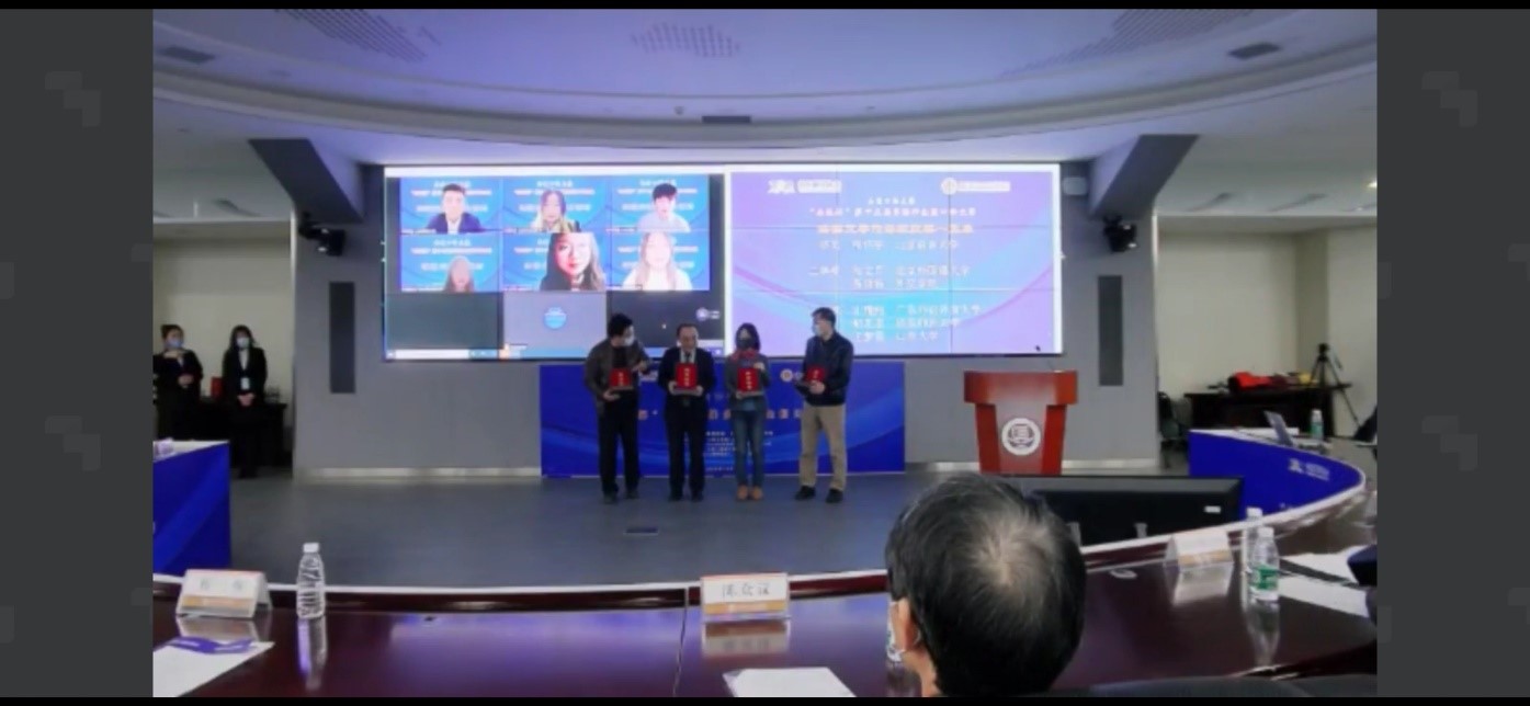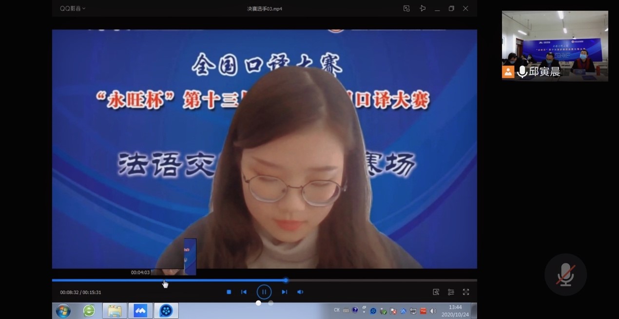 今年,结合防疫工作,组委会首次采用线上线下相结合的方式进行比赛。经过院系推荐、网络公开赛初赛,法语交传组共有15名选手进入复赛。复赛试题分为法译汉和汉译法两个部分。经评审组现场打分、点评,包括王梦雪在内的6名同学进入决赛,而她也是决赛选手中唯一一名本科生。经过激烈角逐,王梦雪同学获得法语交传组三等奖。