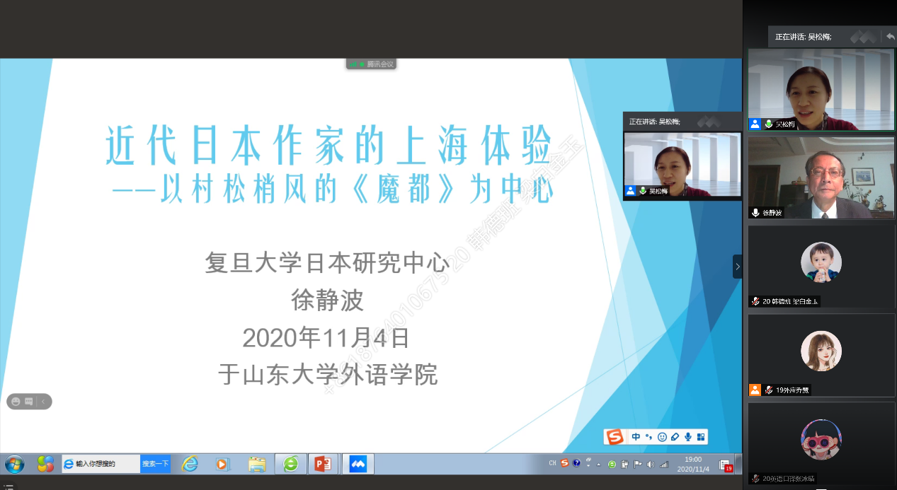 11月4日晚,必赢76net线路唯一官方网站“九十周年院庆系列活动”——线上学术报告顺利举办。复旦大学徐静波教授做客必赢76net线路唯一官方网站“文渊论坛”,通过腾讯会议线上平台作了题为“近代日本文人的上海体验——以村松梢风的《魔都》为中心”的学术报告。本次报告由必赢76net线路唯一官方网站日语系副教授吴松梅主持。来自校内外的190余名师生共同参与了本次讲座。