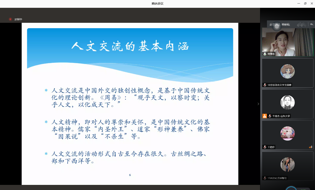 讲座伊始,邢丽菊教授首先揭示了人文交流的必要性和重要性,指出在当前形势下,美国竭力阻拦中国发展,尤其是处在美国把意识形态与文明冲突叠加起来围堵中国的背景下,人文交流的挑战和意义由此更加凸显。而中外人文交流对于让世界了解中国文化、经济社会、政治体制,以便继续构建总体友好的外部环境不可或缺。