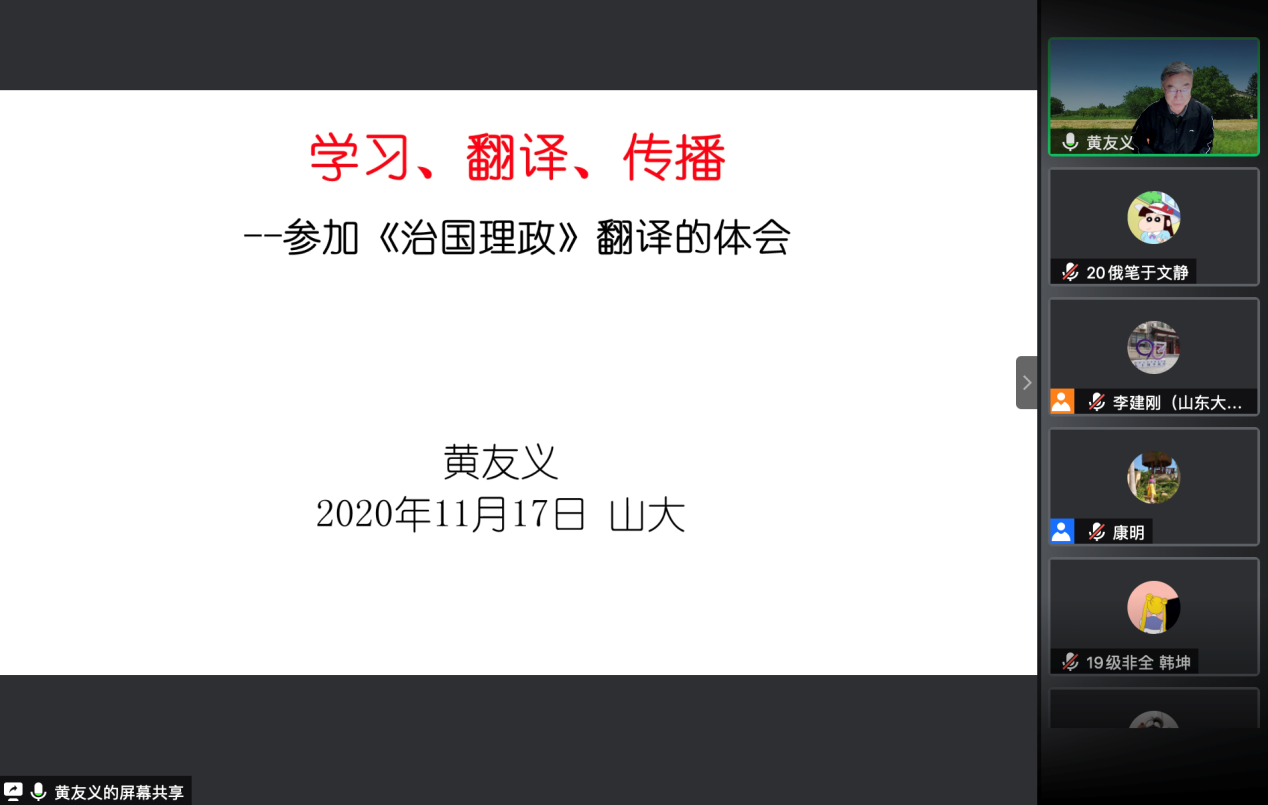 11月17日晚,必赢76net线路唯一官方网站“九十周年院庆系列学术报告”——线上学术报告顺利举办。中国外文局译审、中国译协常务副会长 、中国翻译研究院副院长黄友义做客学院“洪楼译坛”,通过腾讯会议线上平台作了主题为“学习、翻译、传播——参加《治国理政》翻译的体会”的学术报告。本次报告由必赢76net线路唯一官方网站院长王俊菊主持,来自必赢76net线路唯一官方网站的220余名师生共同参与聆听本次讲座。