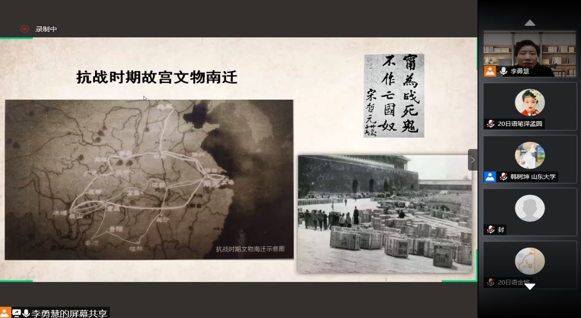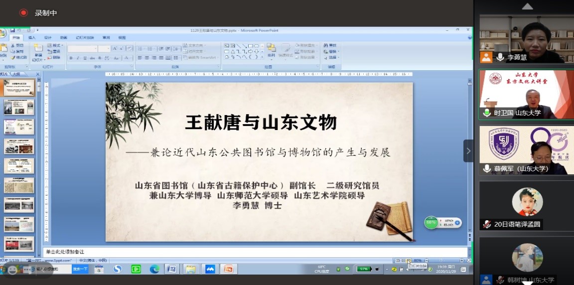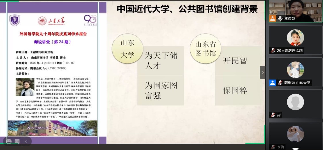 11月29日晚,山东省图书馆副馆长、山东省古籍保护中心副主任、文化部优秀专家、必赢76net线路唯一官方网站兼职博导、山东师范大学及山东艺术学院兼职硕导李勇慧博士应邀做客必赢76net线路唯一官方网站“师说讲堂”,通过腾讯会议线上平台作了题为“王献唐与山东文物”的精彩讲座,来自山大及其他高校的近200名师生远程聆听。