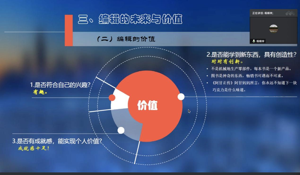 杨成舜编审先从文学作品的翻译出版与跨文化交流的关系说起,围绕四个问题进行讲述:一是对于“编辑”之词的联想;二是简介一本书如何印制完成;三是编辑与一本书的关系;四是编辑工作是否值得从事?他详细讲解编辑出版这个职业的特点和行业大环境,并以青岛出版集团出版的渡边淳一系列丛书为例证,分析编辑的素质、能力(包括导向、眼光、专业和审美)与书稿诞生(包括选题策划、编辑加工、整体设计)的过程,以及编辑发展的未来与价值。明确指出:人的深度阅读离不开图书,编辑这个职业消亡不了。并建议业内人士做好知识服务和技术转型,与新媒体融合发展,同时发挥好教育功能,努力让文化走出去,大力提高文化影响力,讲好中国故事。强调编辑应是杂家、专家、学问家、活动家和经营家,是集多种角色为一体的精神产品加工者和传播者。他的讲解清晰流畅,内涵丰富,立意深远, 深深地吸引了聆听的在线师生,使大家获益良多,领略到了编辑事业的精博与深奥。