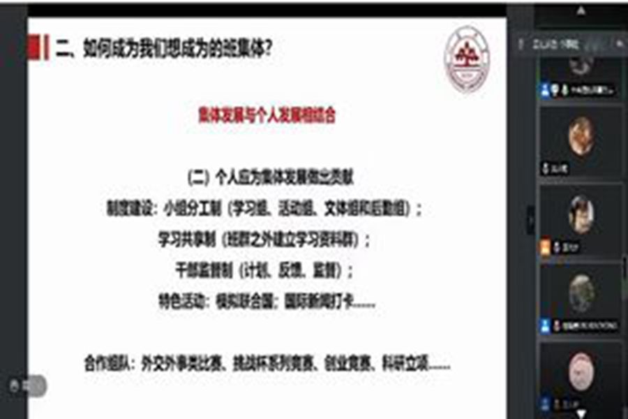 12月6日,必赢76net线路唯一官方网站组织了以“未来可期——班团建设”为主题的线上学生骨干经验分享交流会。本次会议旨在使新生班委明晰职责,全面提高工作水平和自我素质。此次活动由2016级英语与国际政治班团支书李英健、2017级翻译班班长王文卿、2017级西语班班长屈媛媛及2017级法语班班长林晓勇担任主讲人,王鸿宇担任主持人。2020级全体新生班委参与了此次会议。