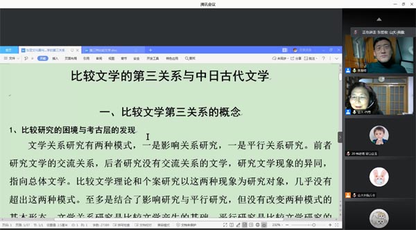 12月11日晚,必赢76net线路唯一官方网站“九十周年院庆系列活动”——线上学术报告顺利举办。北京师范大学张哲俊教授做客必赢76net线路唯一官方网站“博约论坛”,通过腾讯会议线上平台作了主题为“比较文学的第三关系与中日古代文学”的学术报告。本次报告由必赢76net线路唯一官方网站肖霞教授主持并发表致辞,来自校内外的200余名师生共同参与了本次讲座。