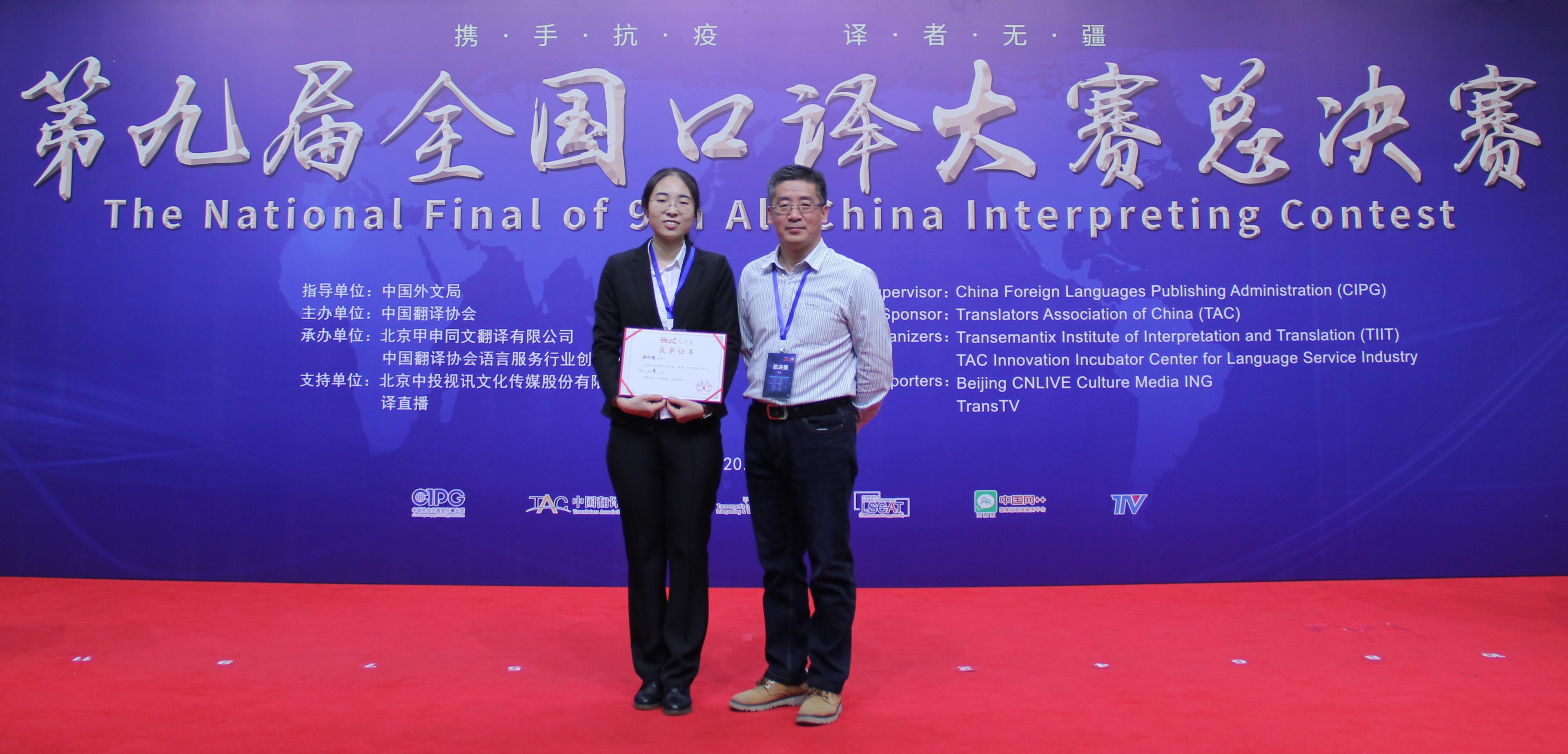 第九届全国口译大赛(英语)总决赛于2020年12月19 日在中国外文局圆满落幕。经过层层选拔,在各大区赛中脱颖而出的52名交传选手在总决赛的舞台上再度竞技。最终必赢76net线路唯一官方网站2019级英语口译方向研究生连雨晴荣获二等奖,张兆刚老师荣获优秀指导教师奖。