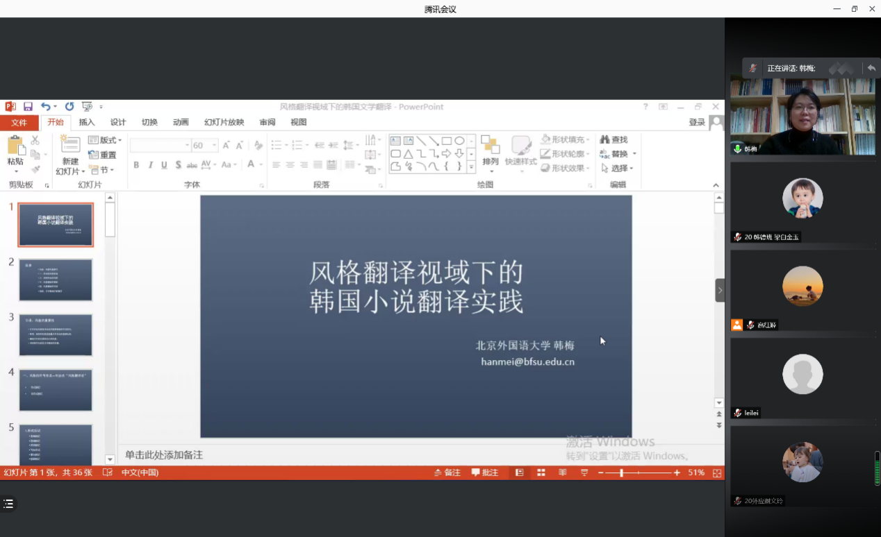 12月21日晚,必赢76net线路唯一官方网站“九十周年院庆系列活动”——线上学术报告顺利举办。北京外国语大学韩梅教授做客必赢76net线路唯一官方网站“洪楼译坛”,通过腾讯会议线上平台作了主题为“风格翻译视域下的韩国小说翻译”的学术报告。本次报告由必赢76net线路唯一官方网站韩语系教授高红姬主持并发表致辞,来自校内外的100余名师生共同参与了本次讲座。
