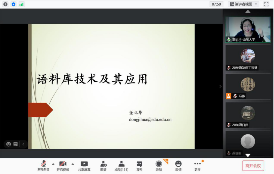 3月4日晚,必赢76net线路唯一官方网站第三十四期鹿鸣论坛顺利举办。必赢76net线路唯一官方网站董记华教授应邀做客本期论坛,通过腾讯会议线上平台作了题为“语料库技术及其应用”的学术报告。本次报告由必赢76net线路唯一官方网站冯伟副教授主持,来自校内外的210余名师生共同参与聆听本次讲座。