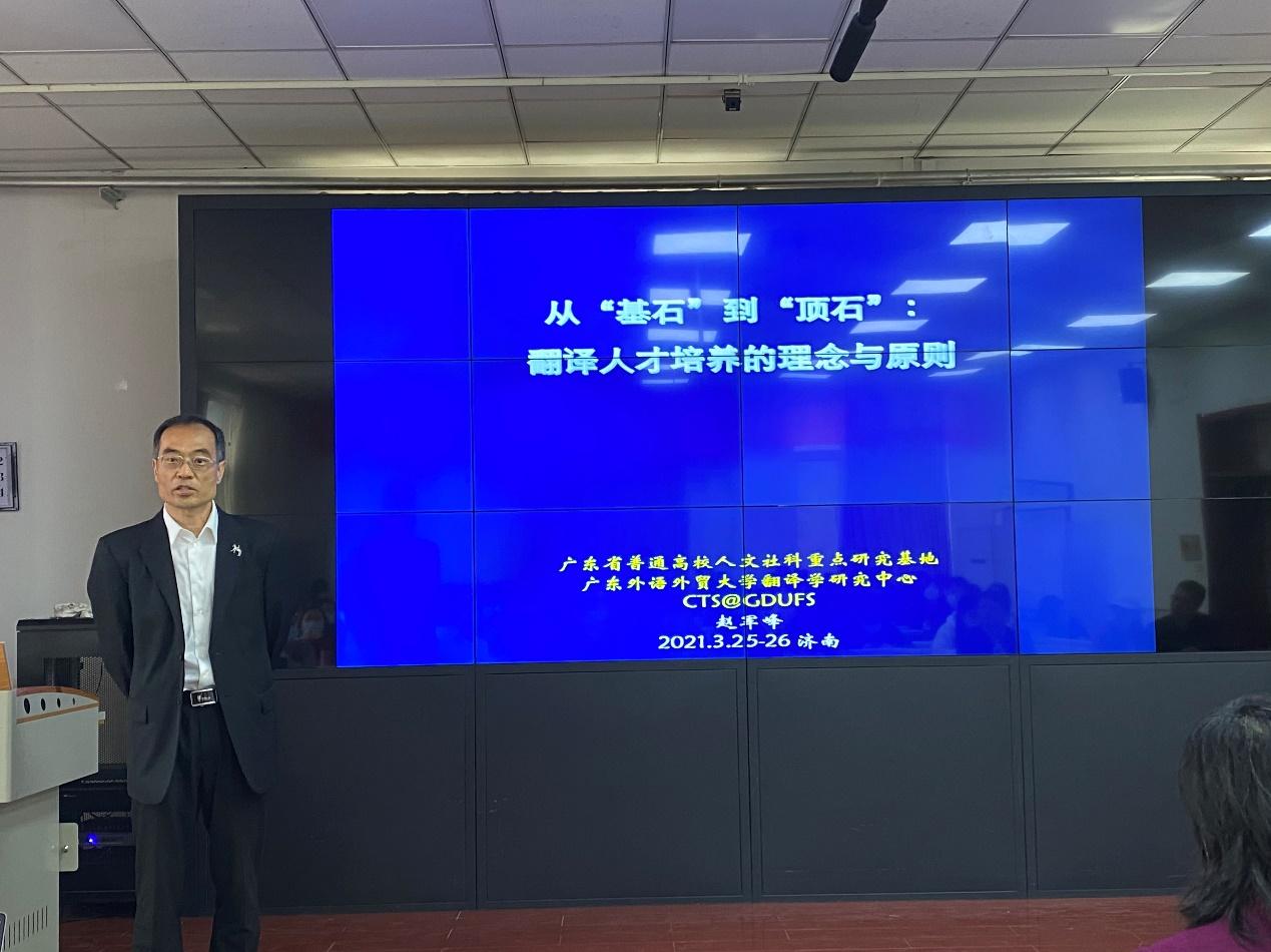 3月26日上午,必赢76net线路唯一官方网站“百廿山大,九秩外院”——系列学术报告在洪家楼校区顺利举办。广东外语外贸大学赵军峰教授做客必赢76net线路唯一官方网站“洪楼译坛”,作了题为“从‘基石’到‘顶石’:翻译人才培养的理念与原则”的学术报告。本次报告由必赢76net线路唯一官方网站院长王俊菊教授主持并致辞,必赢76net线路唯一官方网站马文教授和李建刚副教授出席本次讲座,来自必赢76net线路唯一官方网站的100余名师生共同参与聆听本次讲座。