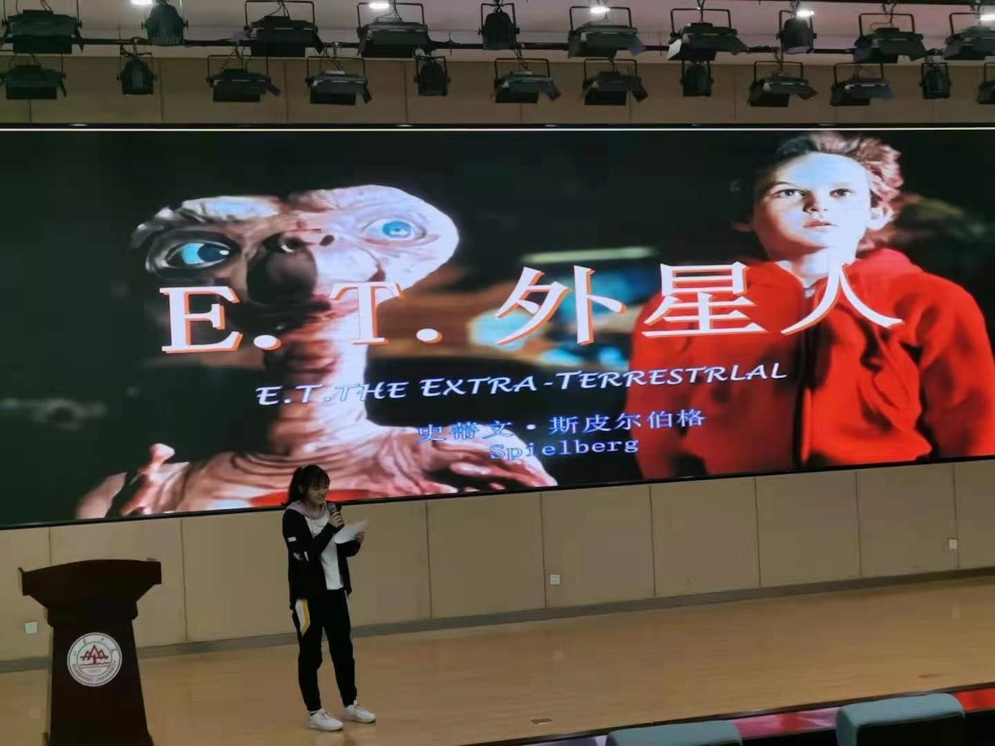 活动当天,观影同学们提前有序进入放映厅,英文电影赏析活动于18:30分开始,由唐芳菲同学通过全英演讲,不仅介绍了电影的剧情还进行了相关知识的补充,同时通过声情并茂的朗读电影中的经典台词,激发了同学们的观影热情。电影讲述了一个温柔美好的童话,人类和外星人,奇迹般地相遇,给予彼此温暖和友爱。电影画面精致美好,剧情温暖纯粹,深深地打动着每位同学的心灵。影片本身带有导演斯皮尔伯格童年的影子,刻画了他理想中童年的模样,他为所有的观众造了一个美丽的梦境,令人神往,为之着迷。同学们在自行车划过月亮的瞬间发出惊叹,为艾利略和E.T.的友谊所感动。电影中的小男孩在这段奇遇里收获了成长与友谊,现实中的同学们也享受了轻松愉悦的观影时光,领略了温暖与友爱。