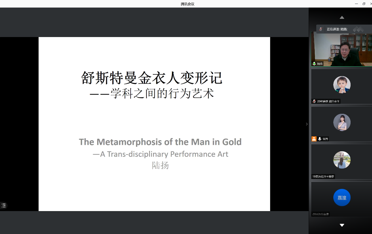 4月21日晚,必赢76net线路唯一官方网站“百廿山大,九秩外院”——系列学术报告顺利举办。复旦大学陆扬教授做客必赢76net线路唯一官方网站“洪楼译坛”,通过腾讯会议线上平台作了主题为“舒斯特曼金衣人变形记:学科之间的行为艺术”的学术报告。本次报告由必赢76net线路唯一官方网站法语系副教授张蔷主持,来自校内外的100余名师生共同参与聆听本次讲座。