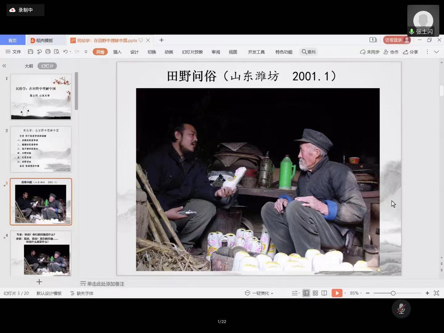 张教授以“田野问事”为开篇。所谓田野问事,就是到田野中了解和接触民俗,从而揭示民俗学真相。他展示了一张2001年去山东潍坊调研时的照片。照片显示张教授在与居民交谈,侧耳倾听老大爷表述文化,借以了解当地民俗。张教授的朋友认为这样的调研方式,会影响当地居民的准确表述,从而对调查结果产生误差。若是到了乡村,由于自己的介入,记录时极易改写民俗,从而失去本意。接着他又展示2015年在河北广宗调研时拍摄的照片。照片显示,张教授已改变调研方式,以旁观者的视角去记录真实的民间宗教仪式。