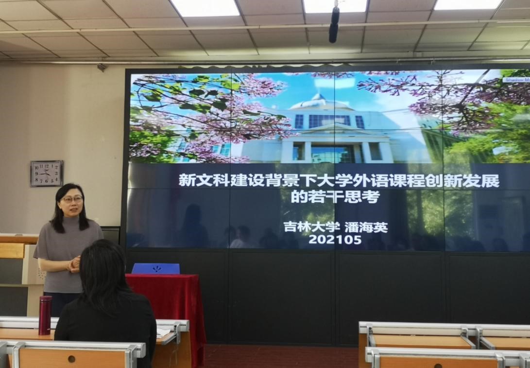 潘海英教授以“新文科建设背景下大学外语课程创新发展的若干思考”为主题,提出新文科建设应突破传统文科的思维模式,以继承与创新、交叉与融合、协同与共享为主要途径,促进多学科的交叉与深度融合,更好的服务于新时代的发展要求。潘教授向老师们介绍了吉林大学在大学外语教学课程方面的探索与创新,即依托于线上线下混合式教学模式构建“可复用、可创新、可研究、可持续”的外语教学体系。她从“课程理念创新、课程目标多元、课程类型多样”三个角度,探讨了大学外语课程应如何顺应新时代语境,充分利用语言教学的综合优势,积极迎接挑战,推动学科融合并大力推进课程改革创新。潘教授最后指出,大学外语部应提供丰富优质的外语课程、建设多样易学的外语资源、打造智能高效的外语云平台,为跨院系、跨学科的人才培养提供支持,尤其是助力于培养学生的文化认同与国家意识。