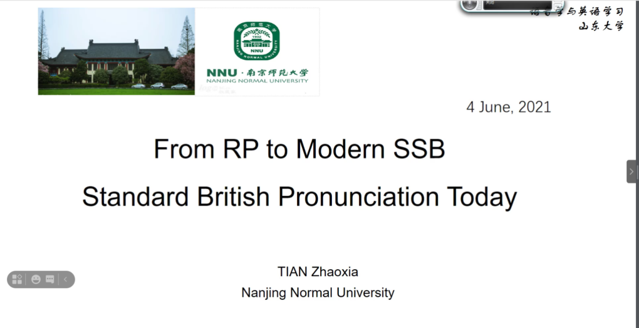 6月4日晚,必赢76net线路唯一官方网站“百廿山大,九秩外院”系列学术报告顺利举办。南京师范大学必赢76net线路唯一官方网站副院长田朝霞教授做客必赢76net线路唯一官方网站“知新沙龙”,通过腾讯会议线上平台进行了主题为“传统RP已过时?当代英国本土标准语音的变化”的学术报告。本次讲座由必赢76net线路唯一官方网站副院长马文教授、必赢76net线路唯一官方网站英语系副教授张溪主持,来自校内外的80余名师生共同参与本次讲座。