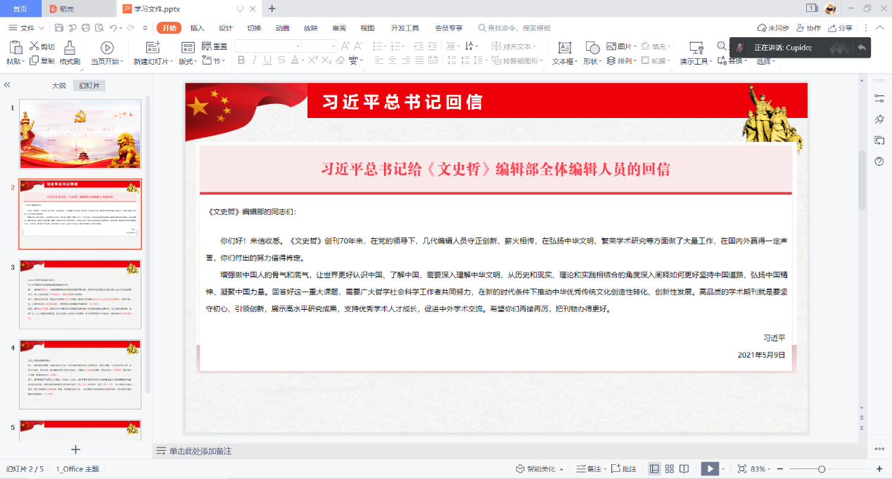 随后,杨凯同志带领团队成员深入学习了习近平总书记给《文史哲》编辑部的重要回信精神并组织团队成员分享学习心得。王颖同志指出,总书记的重要回信精神将进一步推动新文科建设走深、走实;团队各位科研工作者要勇担时代使命,在加强研究本土化的同时也要增强研究的国际传播力。董记华同志指出,必赢76net线路唯一官方网站以文史见长,外语作为文史类的主要学科之一,也要积极推动科研成果的创造性转化,为学校人文学科进一步发展贡献力量。杨港同志结合自身平台课经验分享了如何进一步提升师生的跨文化交际意识。张聪同志结合教学创新和《二语写作》编辑部工作分享了自己对回信精神的深刻领悟。最后,张延飞同志就如何利用学科交叉融合的“催化剂”推动新文科建设这一话题带领大家进行了进一步学习。