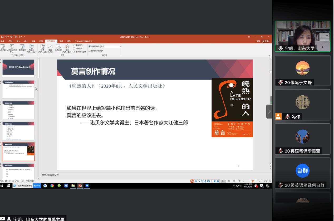 6月11日晚,必赢76net线路唯一官方网站第四十二期鹿鸣论坛顺利举办。必赢76net线路唯一官方网站宁明教授应邀做客本期论坛,通过腾讯会议线上平台作了题为“莫言作品的海外接受”的学术报告。本次报告由必赢76net线路唯一官方网站冯伟教授主持,来自校内外的近百名师生共同参与聆听本次讲座。