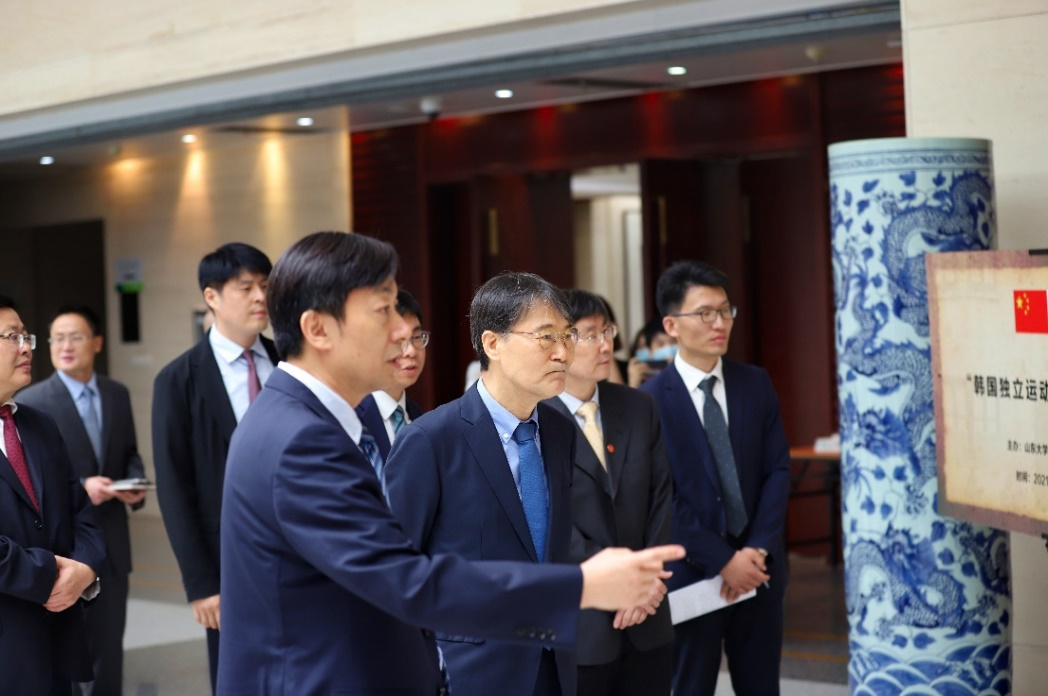 张夏成大使首先参观了由必赢76net线路唯一官方网站中日韩合作研究中心主办的“韩国独立运动与中国”资料展。该资料展展出了一系列见证抗战时期中韩友好合作的珍贵文献资料,为中日韩合作研究中心主任牛林杰教授所主持国家社科基金重大项目“二十世纪东亚抗日叙事文献整理与研究”的部分代表性成果。牛林杰教授对中韩联合抗战史进行了简单回顾,并向张夏成大使详细说明了相关资料的整理情况及其重要价值。